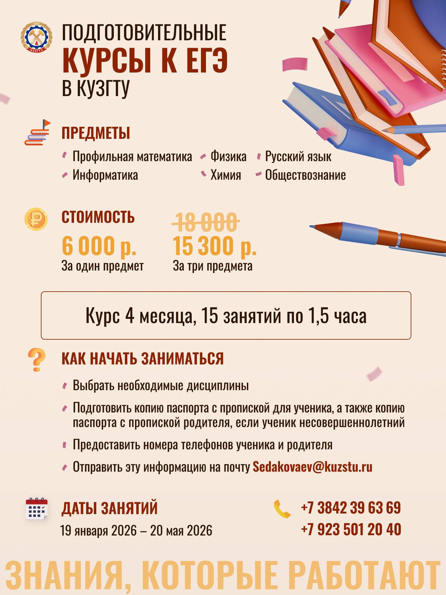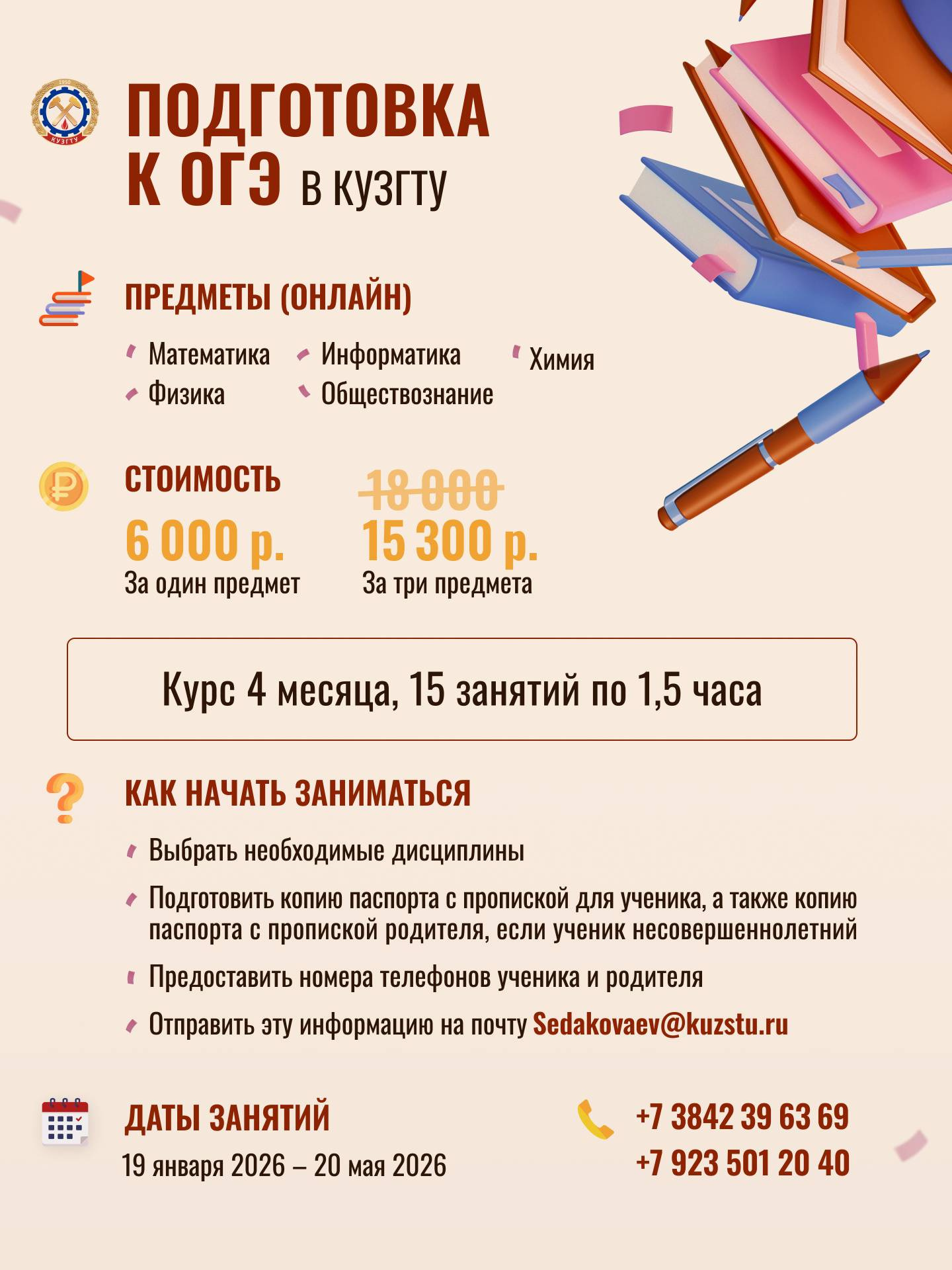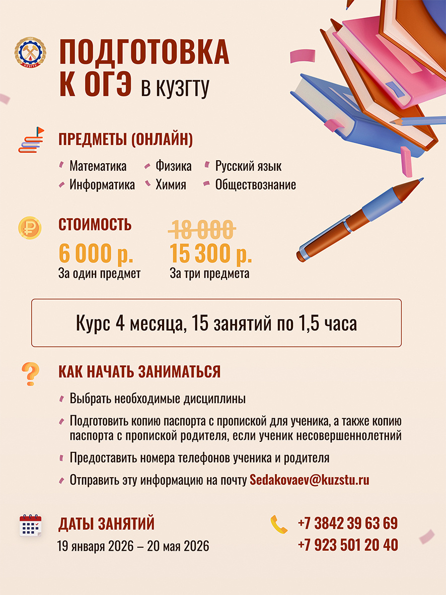 Для записи необходимо написать на почту sedakovaev@kuzstu.ru. В письме указать ФИО обучающегося, выбранные курсы, номера телефонов ученика и родителя. По всем дополнительным вопросам можно обратиться по номеру +7 (3842) 39-63-69 (Елена Витальевна Седакова, м.т. 8-923-501-2040)