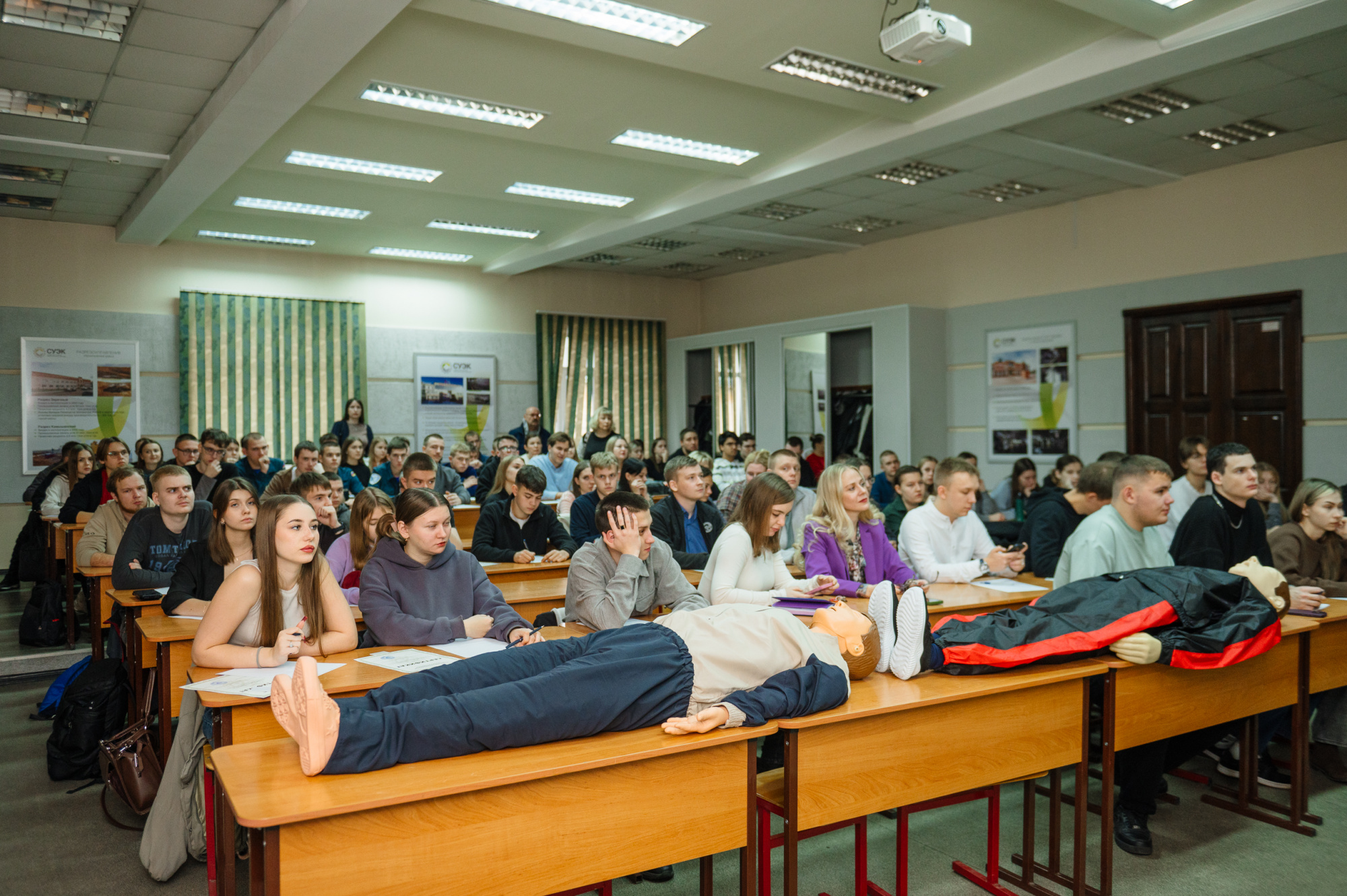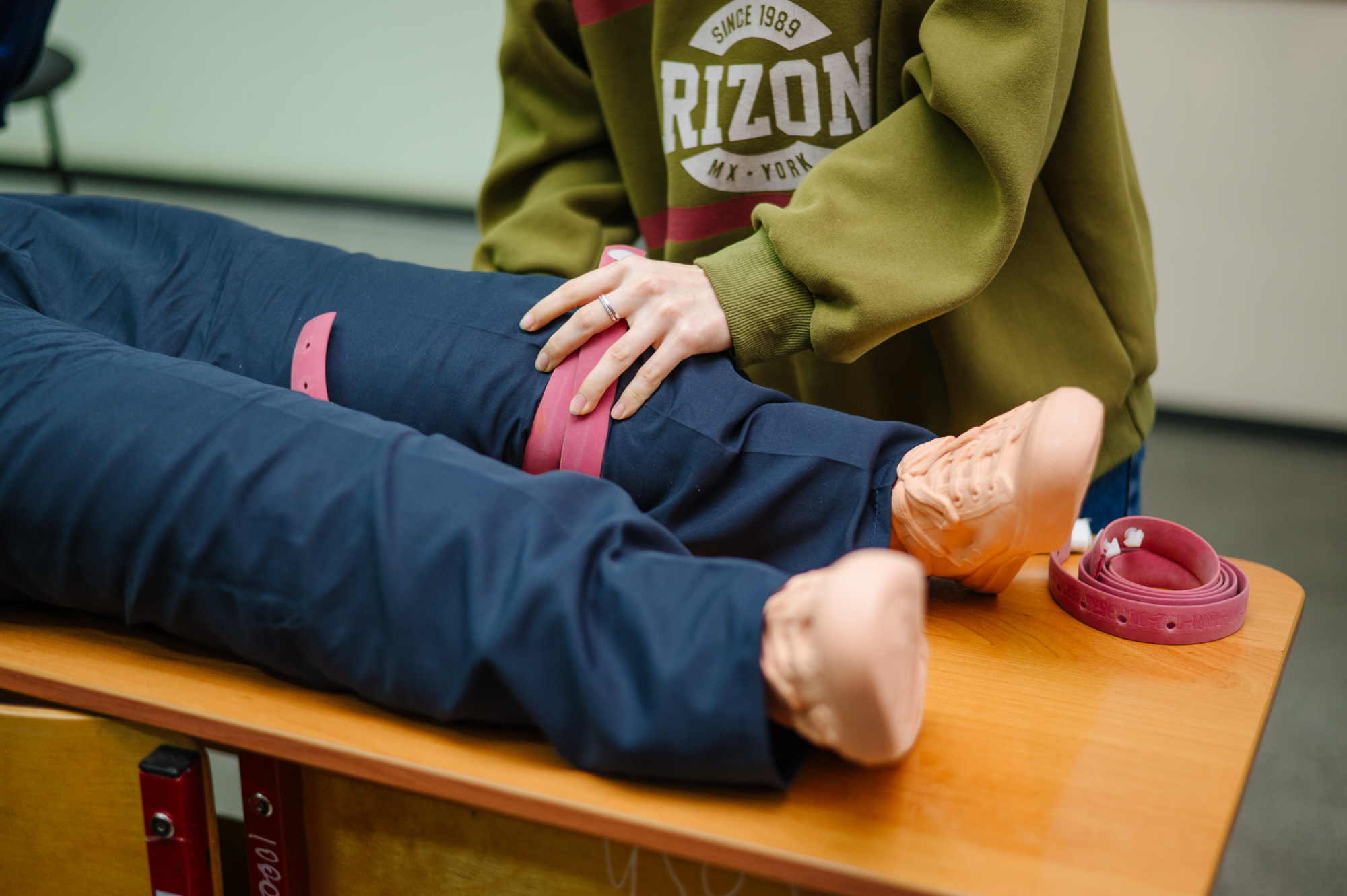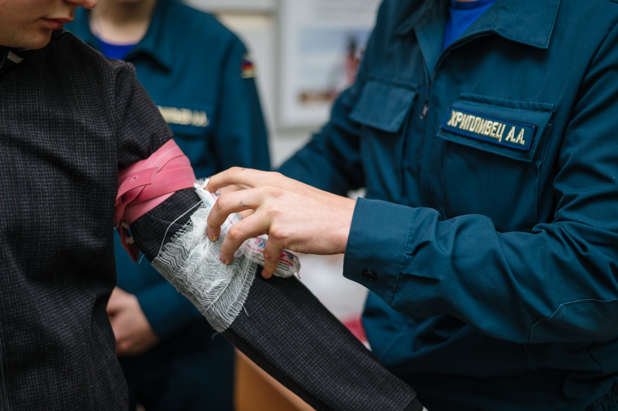 На втором этапе студенты продемонстрировали практические навыки. Десять команд выполняли задания, имитирующие реальные экстренные ситуации. В роил пострадавших выступали манекены и статисты, которым нужно было наложить шины и повязки. Сложность в том, что ребятам необходимо было не только правильно выполнить действия для спасения, но и объяснить последовательность и обоснованность каждого своего шага.
