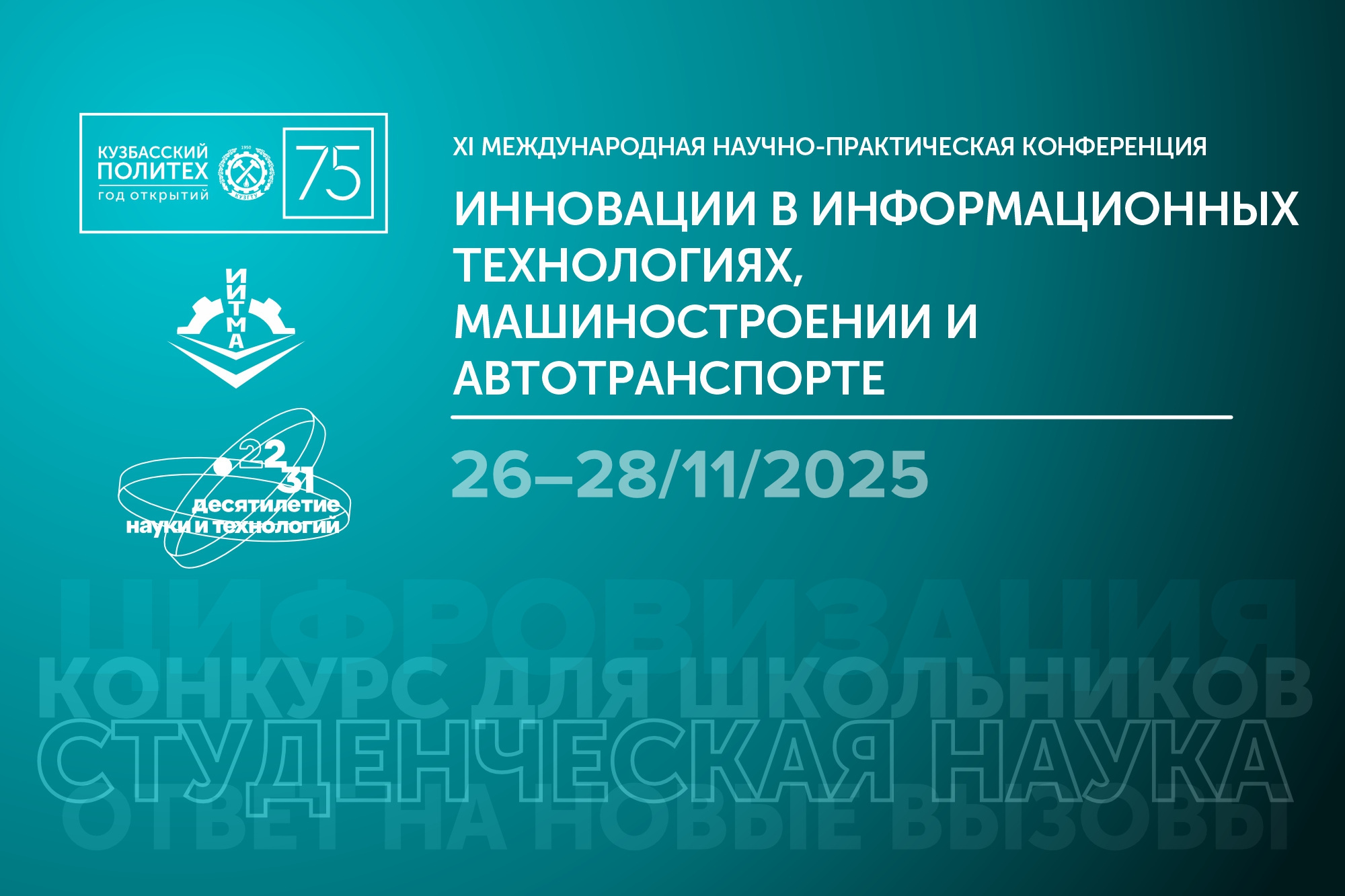 С 26 по 28 ноября КузГТУ проведет IХ Международная научно-практическая конференция «Инновации в информационных технологиях, машиностроении и автотранспорте». К участию приглашаются студенты, аспиранты, преподаватели, ученые, сотрудники вузов, НИИ и промышленных предприятий.