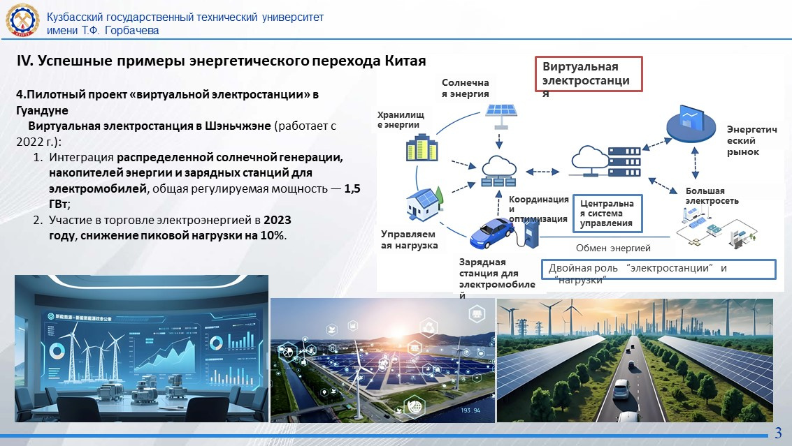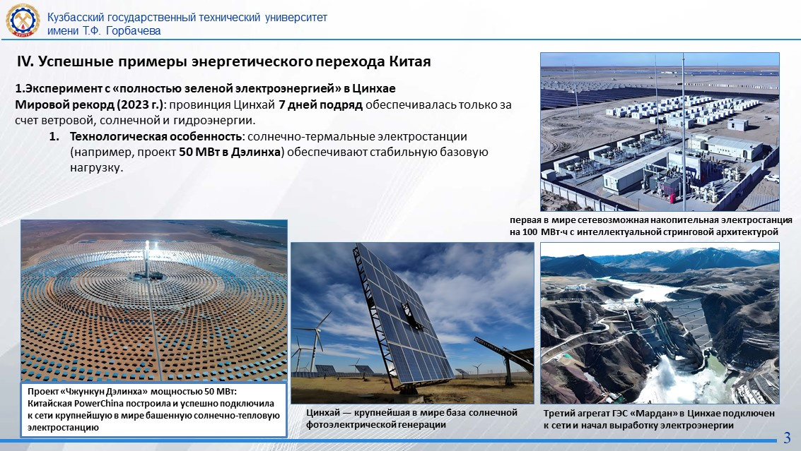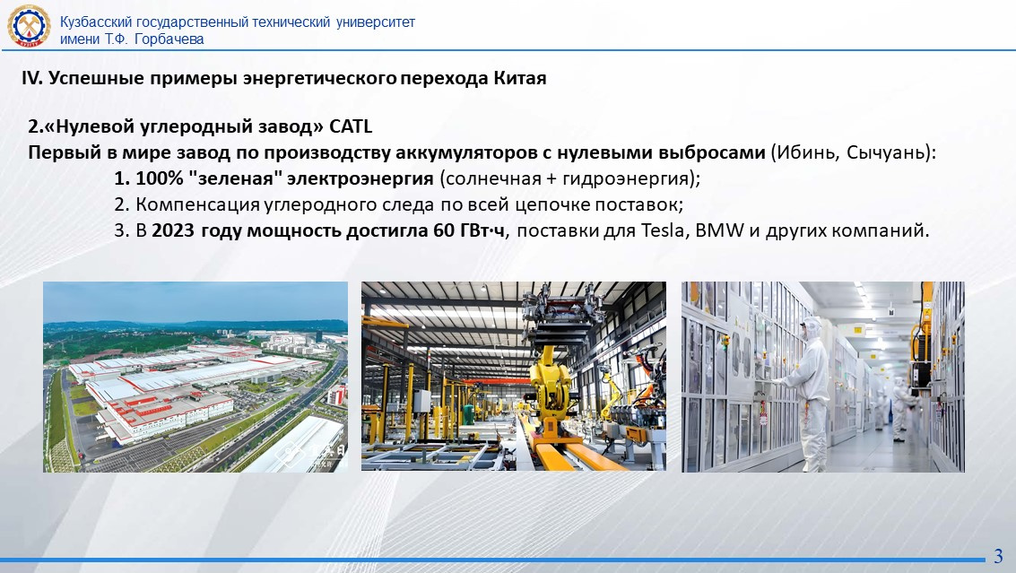 Например, в Шэньчжэне виртуальная электростанция обеспечивает управление мощностью 1 ГВт, что эквивалентно отказу от двух угольных ТЭС. В Сычуане создан первый в мире завод по производству аккумуляторов с нулевыми выбросами. Завод работает на 100% «зеленой» электроэнергии (солнечная + гидроэнергия), предусмотрена компенсация углеродного следа по всей цепочке поставок; в 2023 году мощность достигла 60 ГВт·ч.