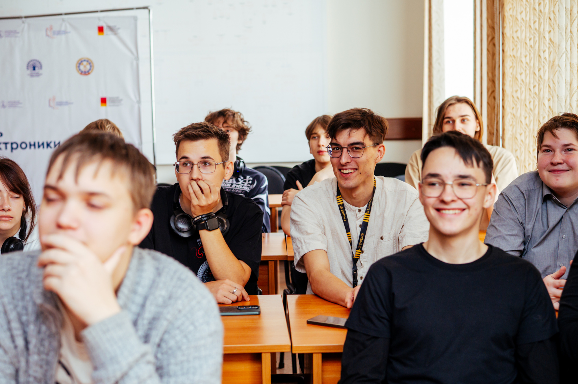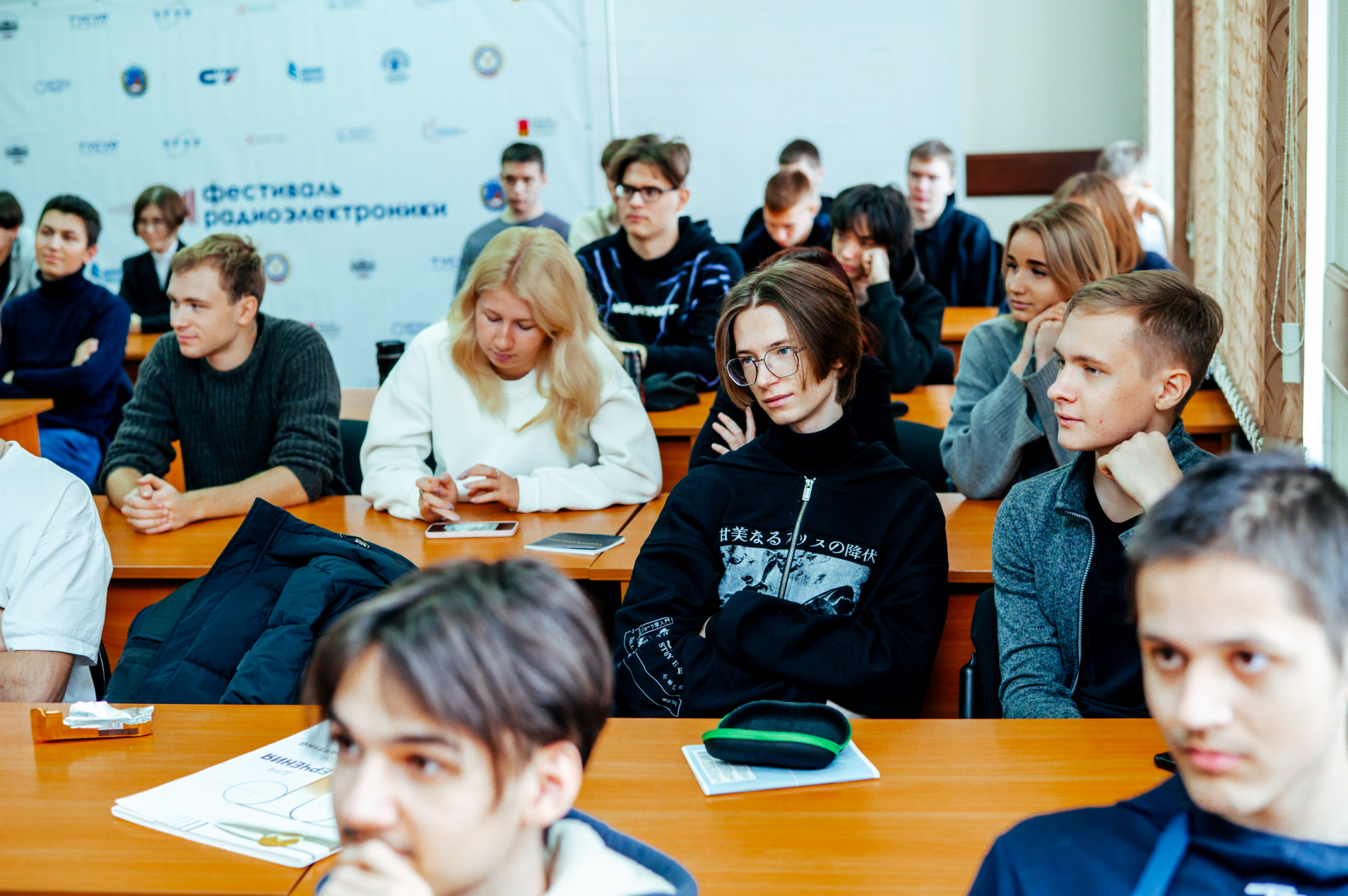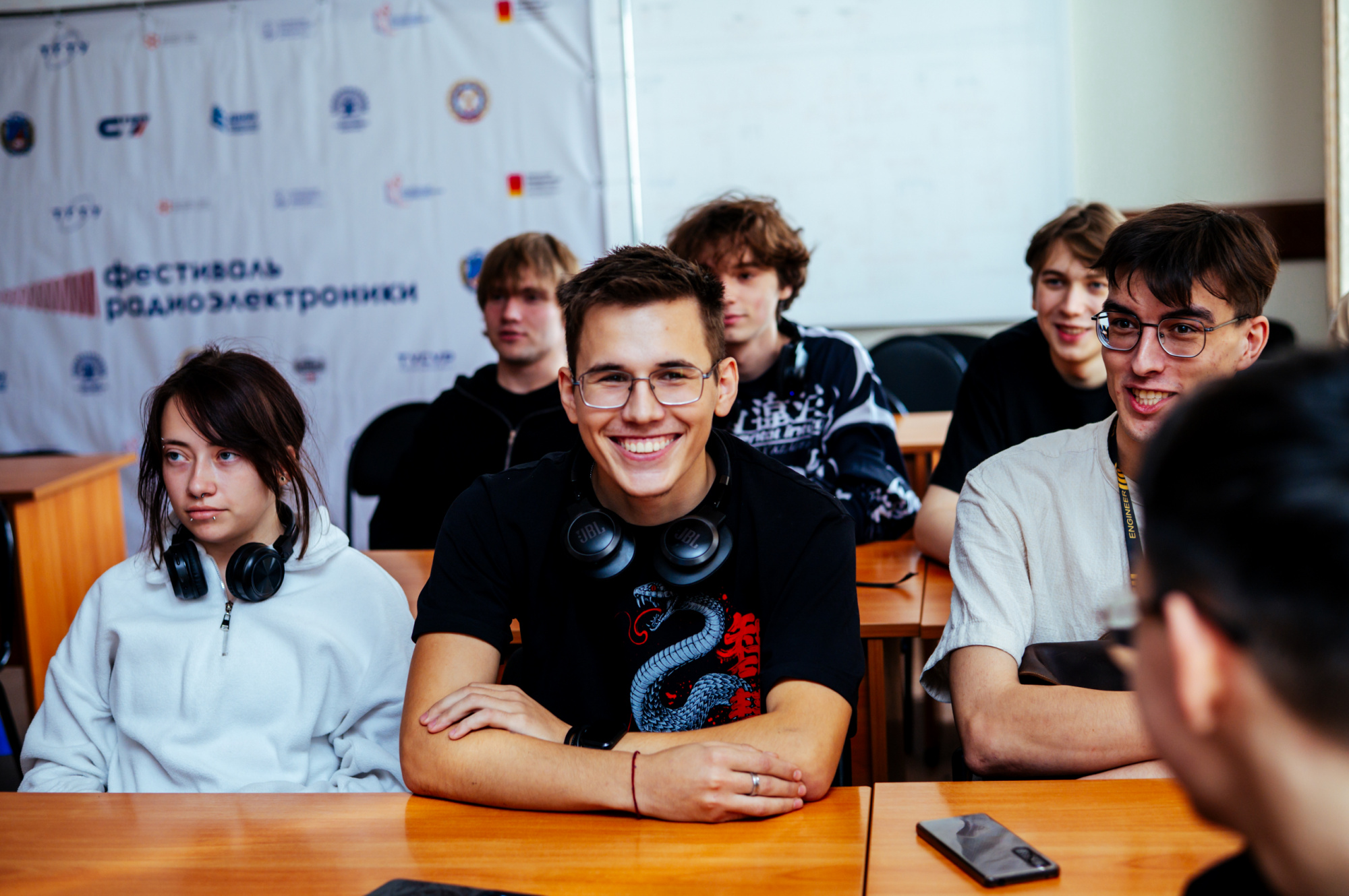 Нововведение фестиваля! Студентов первого курса посвятили в электроники. Для начала старшекурсники с помощью викторины проверили базовые знания по специальности своих младших коллег, спрашивали, например, что такое холодная пайка, паразитная емкость и ток утечки.
