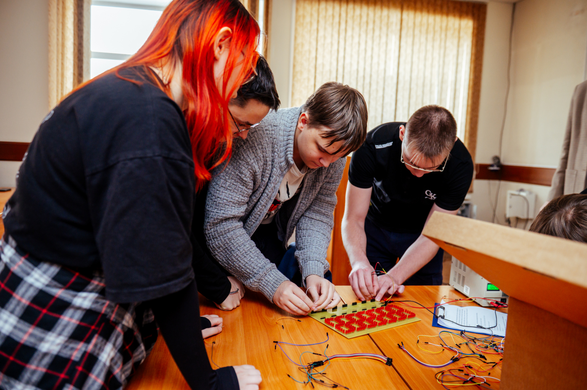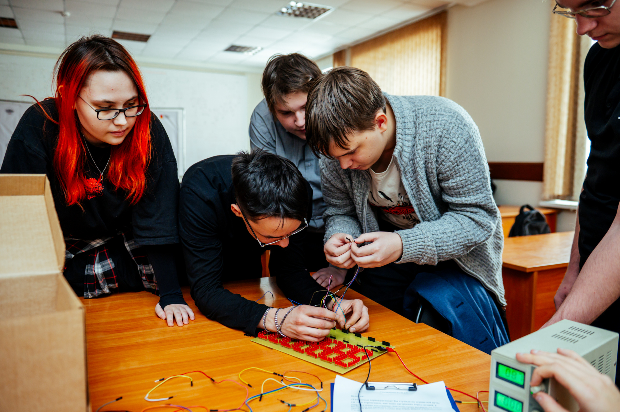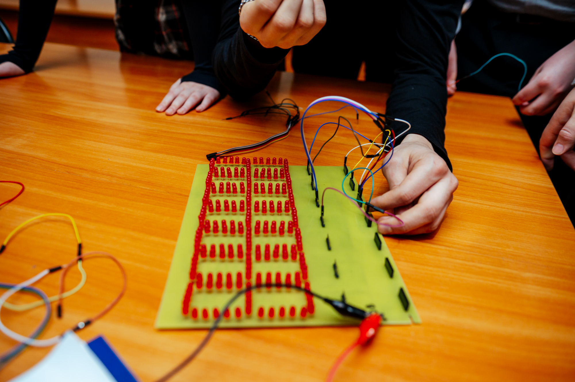 Полностью готовая работа включает в себя спаянную плату, которая при подключении к питанию будет работать. Если схема правильно спаяна, то на ней по кругу замигают «огоньки», – пояснил Илья Горбунов. – Студенты, как правило, без проблем справляются с заданием, потому что в рамках учебных занятий у них уже была практика, они должны по документации понять, куда и как расставить компоненты и правильно спаять их. То есть здесь задействована их теоретическая и практическая база, которую они получили на занятиях.