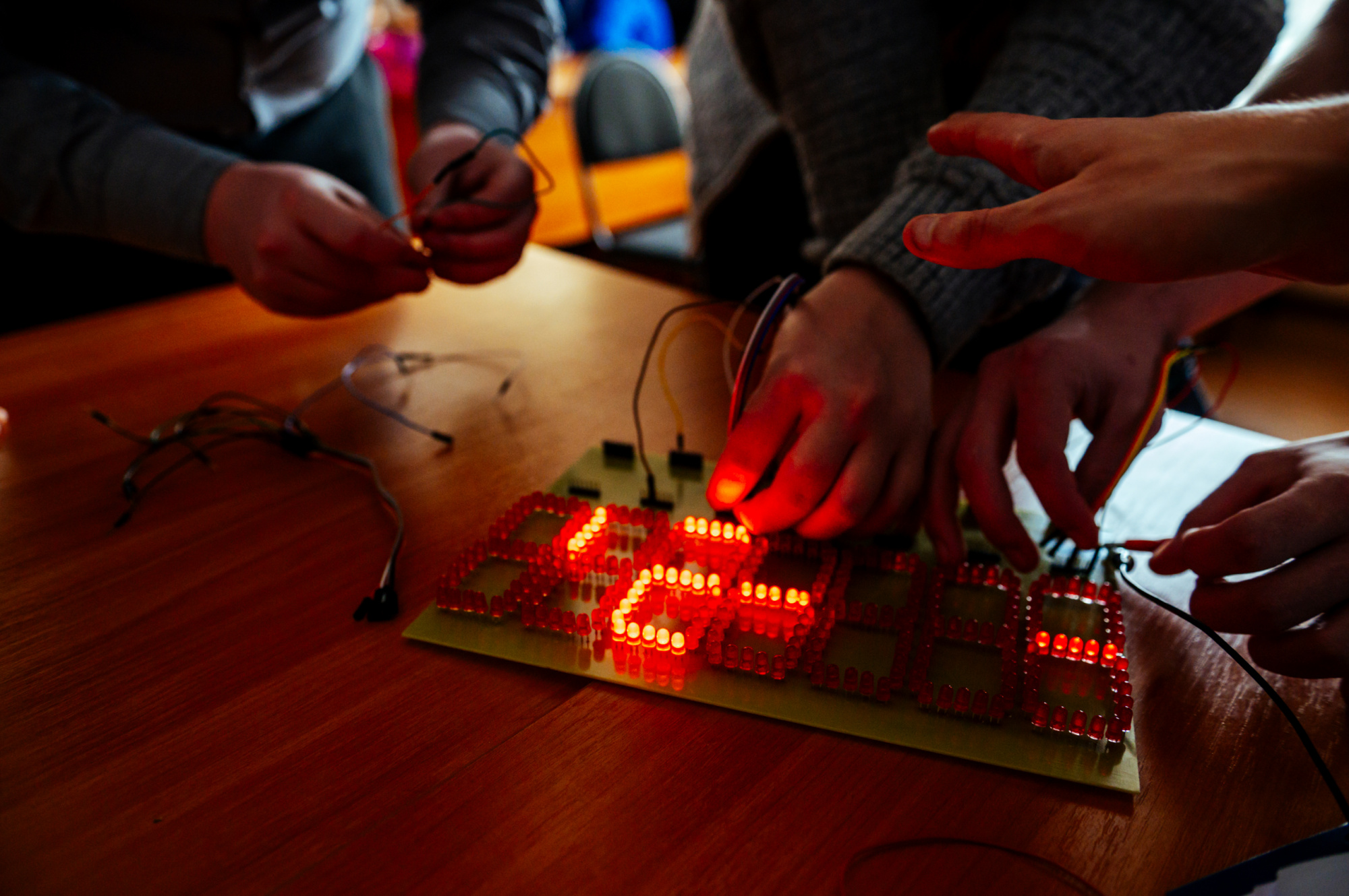 Далее благодаря дружным совместным усилиям символ группы, её название – НЭб-251– замерцало яркими светодиодными огнями, когда ребята правильно подключили все провода на электронном табло. И какое посвящение без клятвы?! Первокурсники торжественно пообещали «в горе и в радости, в сессию и на каникулах, с мультиметром в руках и с даташитом в сердце служить великой науке – промышленной электронике».