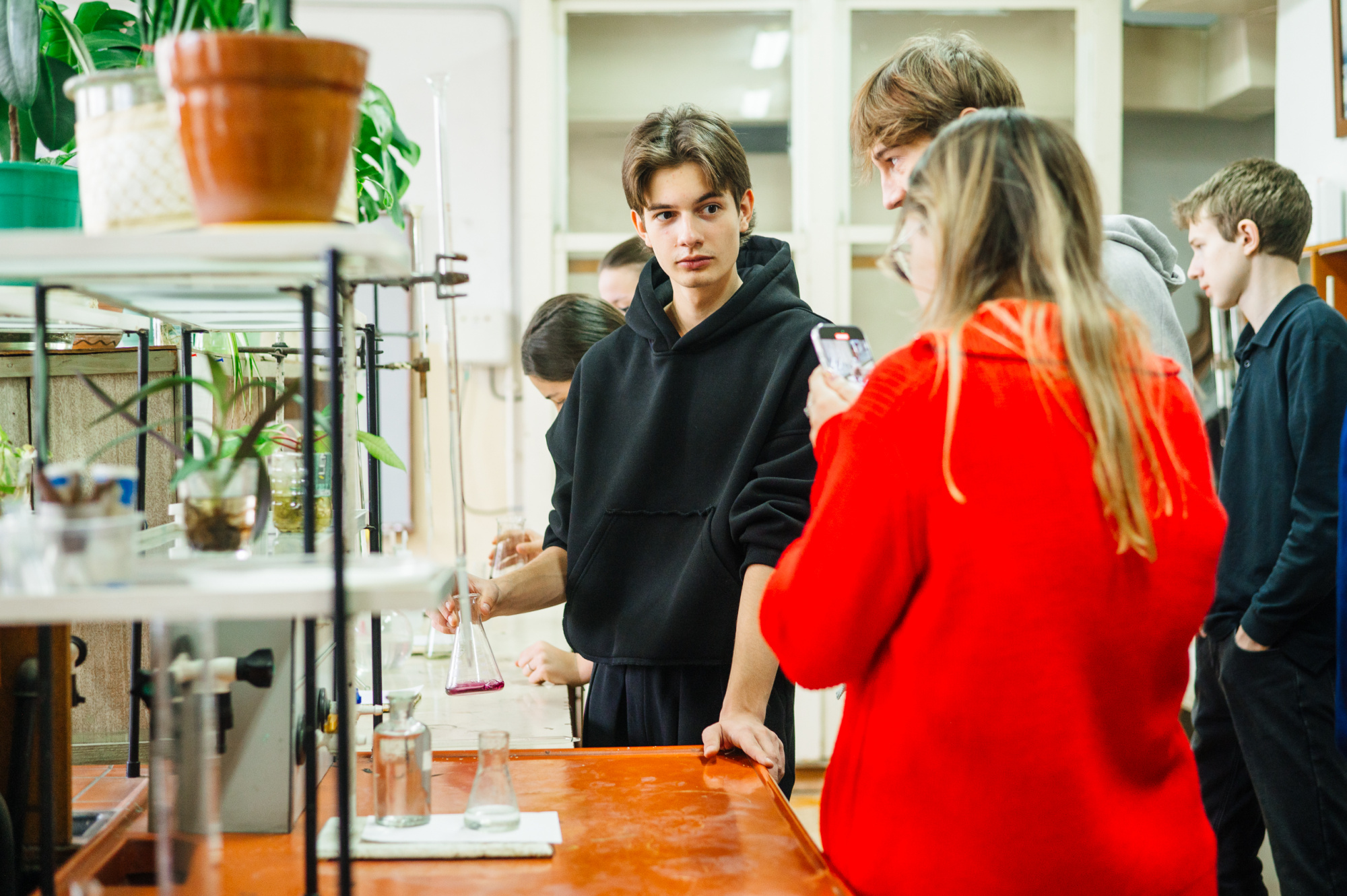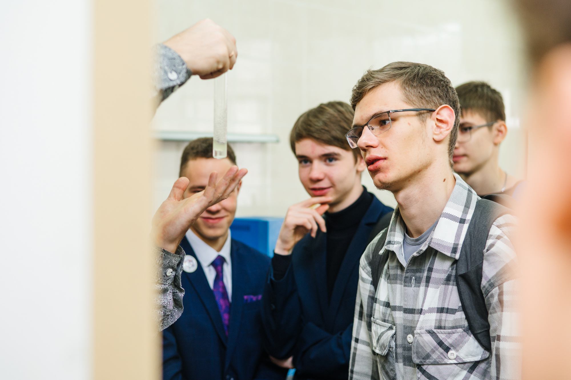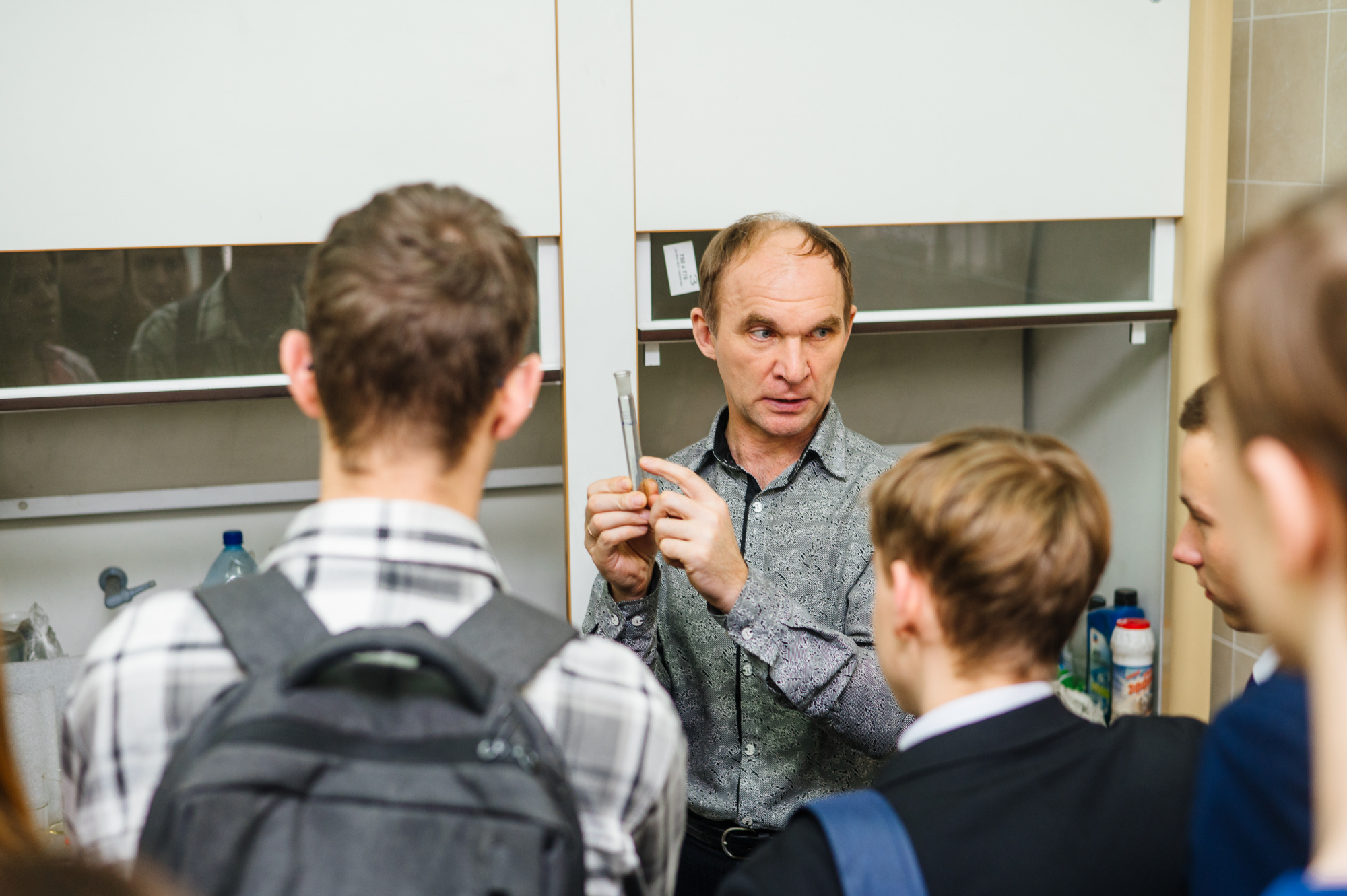 После обеда в студенческой столовой ребята отправились на мастер-классы. Андрей Ушаков, доцент кафедры химической технологии твёрдого топлива, рассказал о химических качествах воды: жесткость, pH, минерализацию, наличие примесей. Например, жесткая вода «богата» солями кальция и магния, именно они образуют накипь в чайнике.