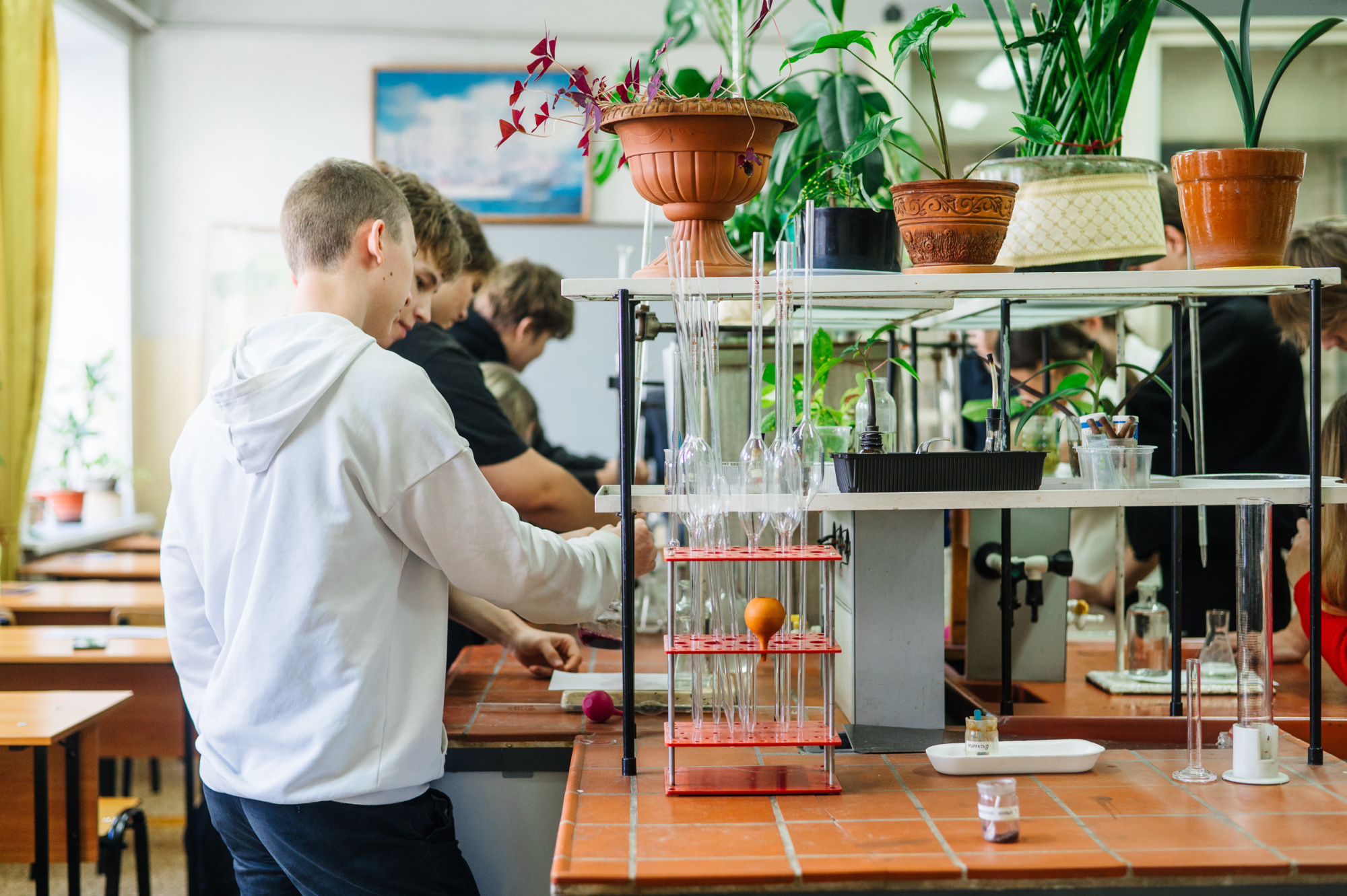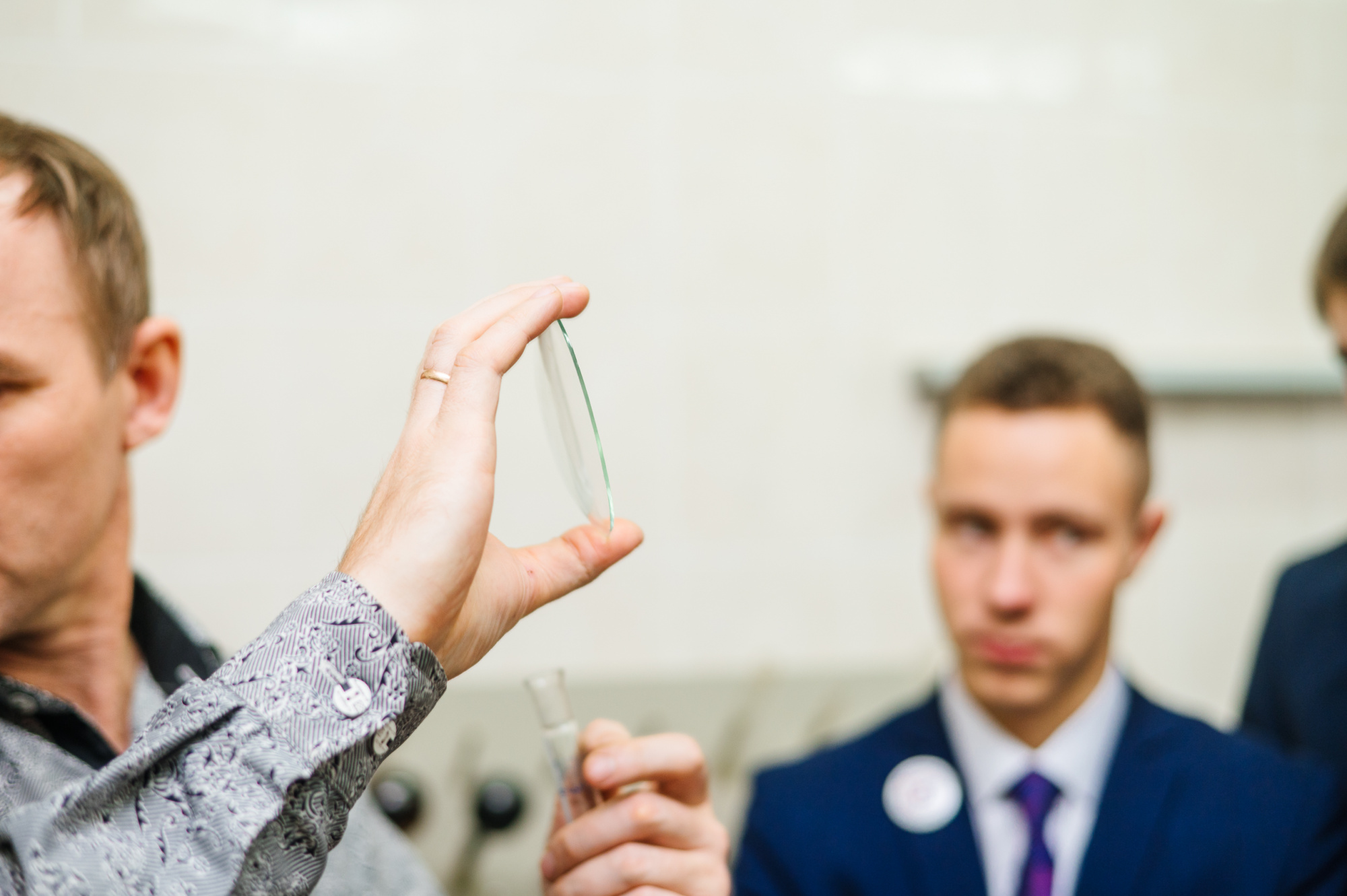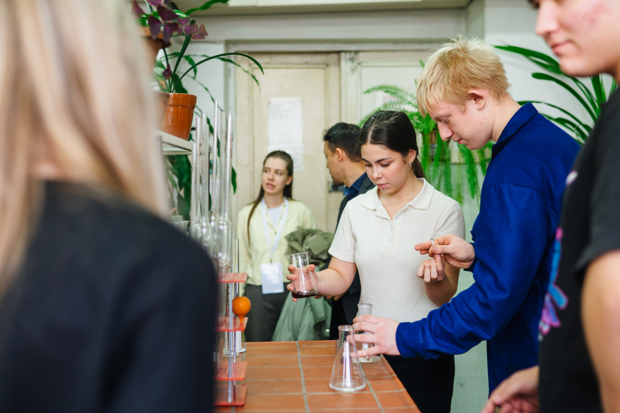 После обеда в студенческой столовой ребята отправились на мастер-классы. Андрей Ушаков, доцент кафедры химической технологии твёрдого топлива, рассказал о химических качествах воды: жесткость, pH, минерализацию, наличие примесей. Например, жесткая вода «богата» солями кальция и магния, именно они образуют накипь в чайнике.