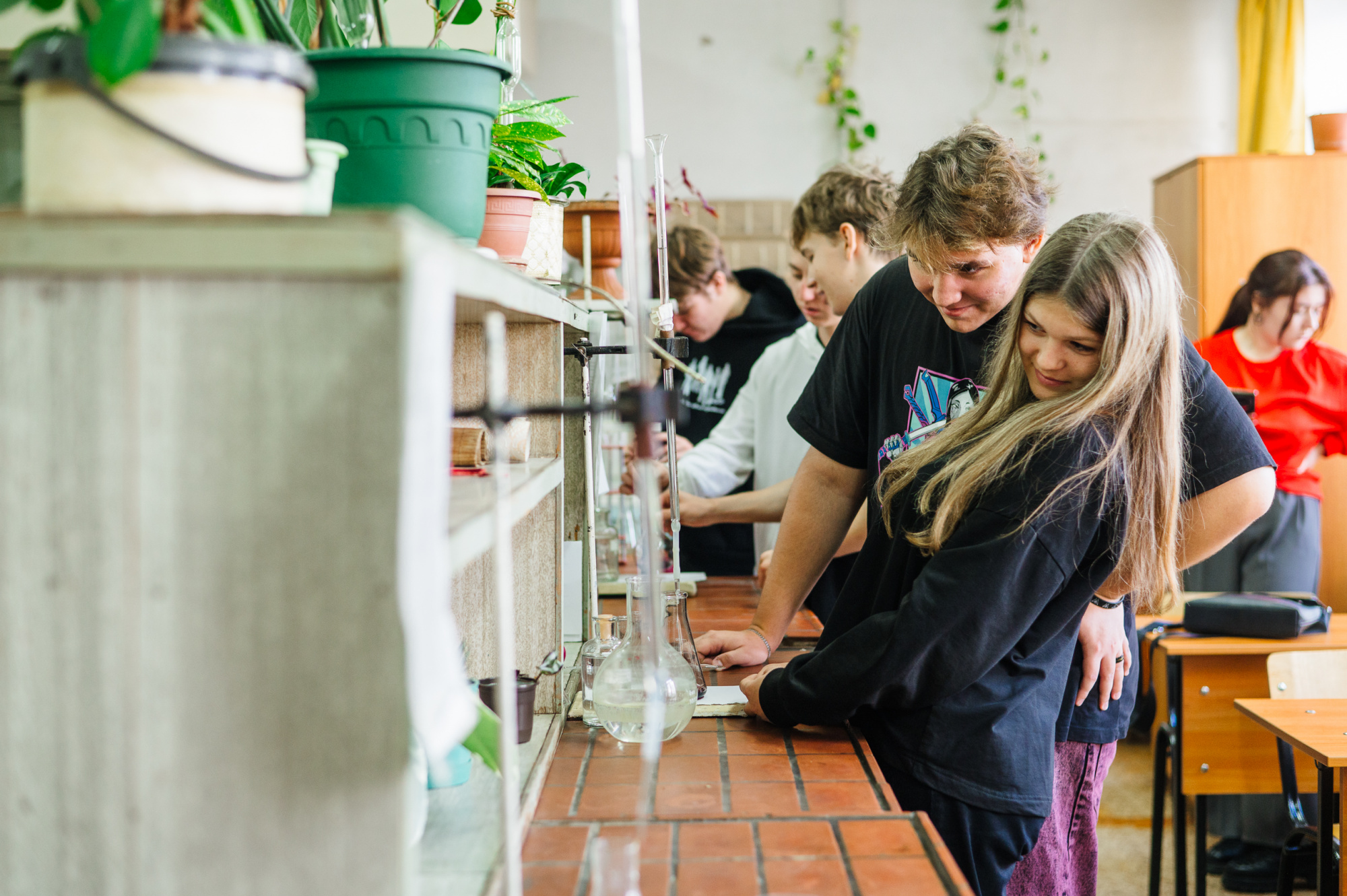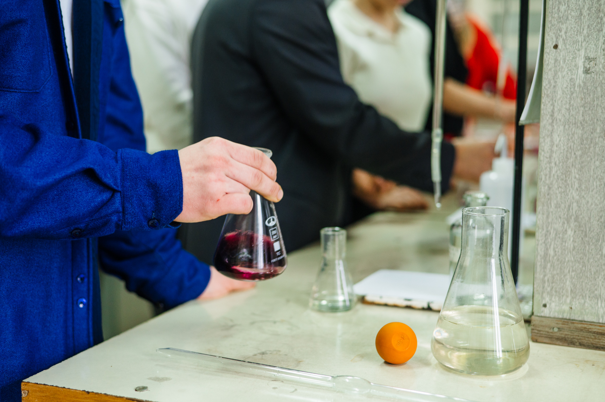 Ребята смогли почувствовать себя настоящими химиками. Они научились с помощью модельных растворов определять качество воды из-под крана. И освоили одну из базовых лабораторных операций – титрование. Это метод определения концентрации вещества в растворе, процесс довольно кропотливый, но результат наглядный – титровальную жидкость добавляют по каплям к раствору, который нужно проанализировать, до тех пор, пока он не поменяет цвет. Далее по формуле и количеству использованного титранта можно высчитать, сколько кальция содержится в воде или общую жесткость воды.