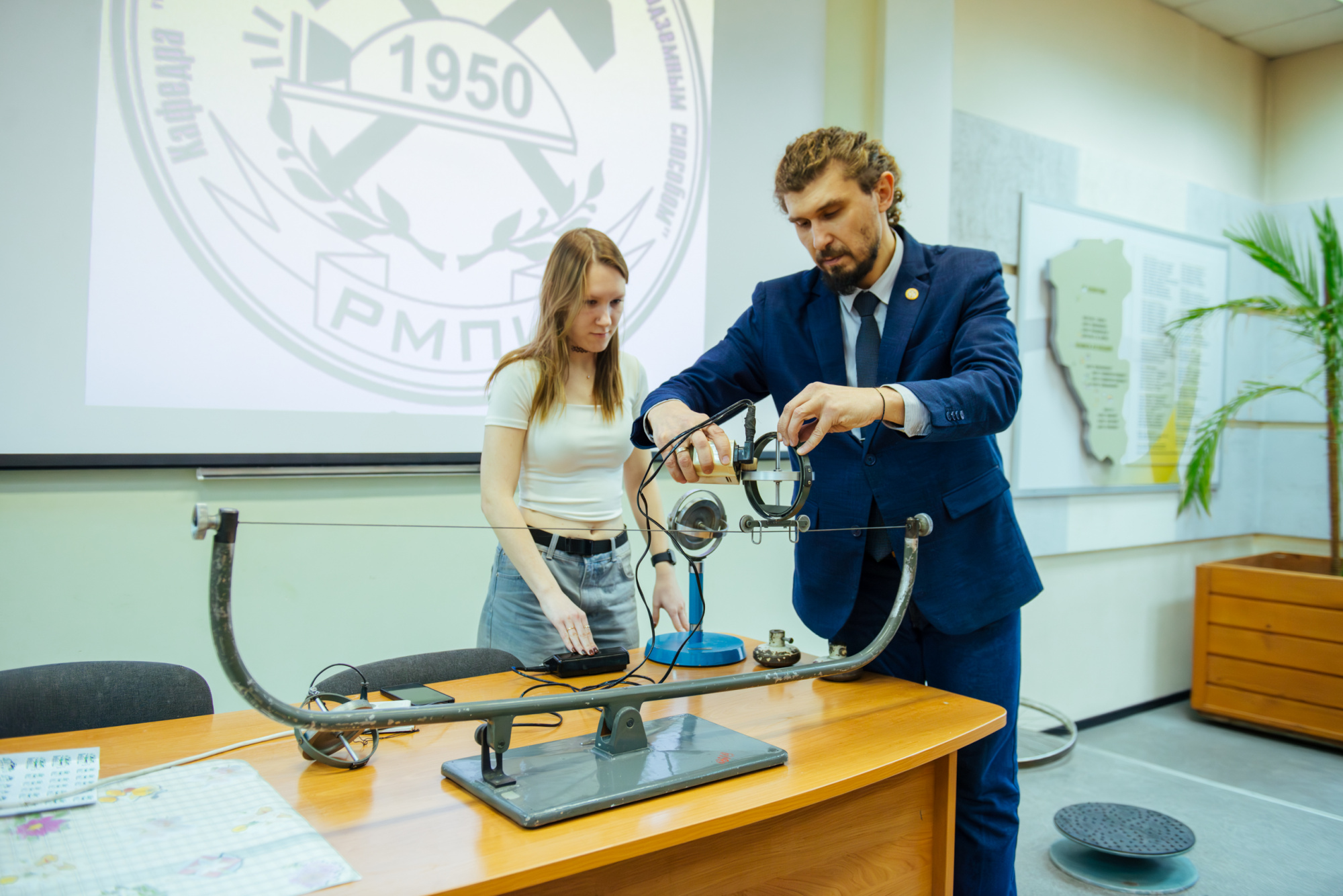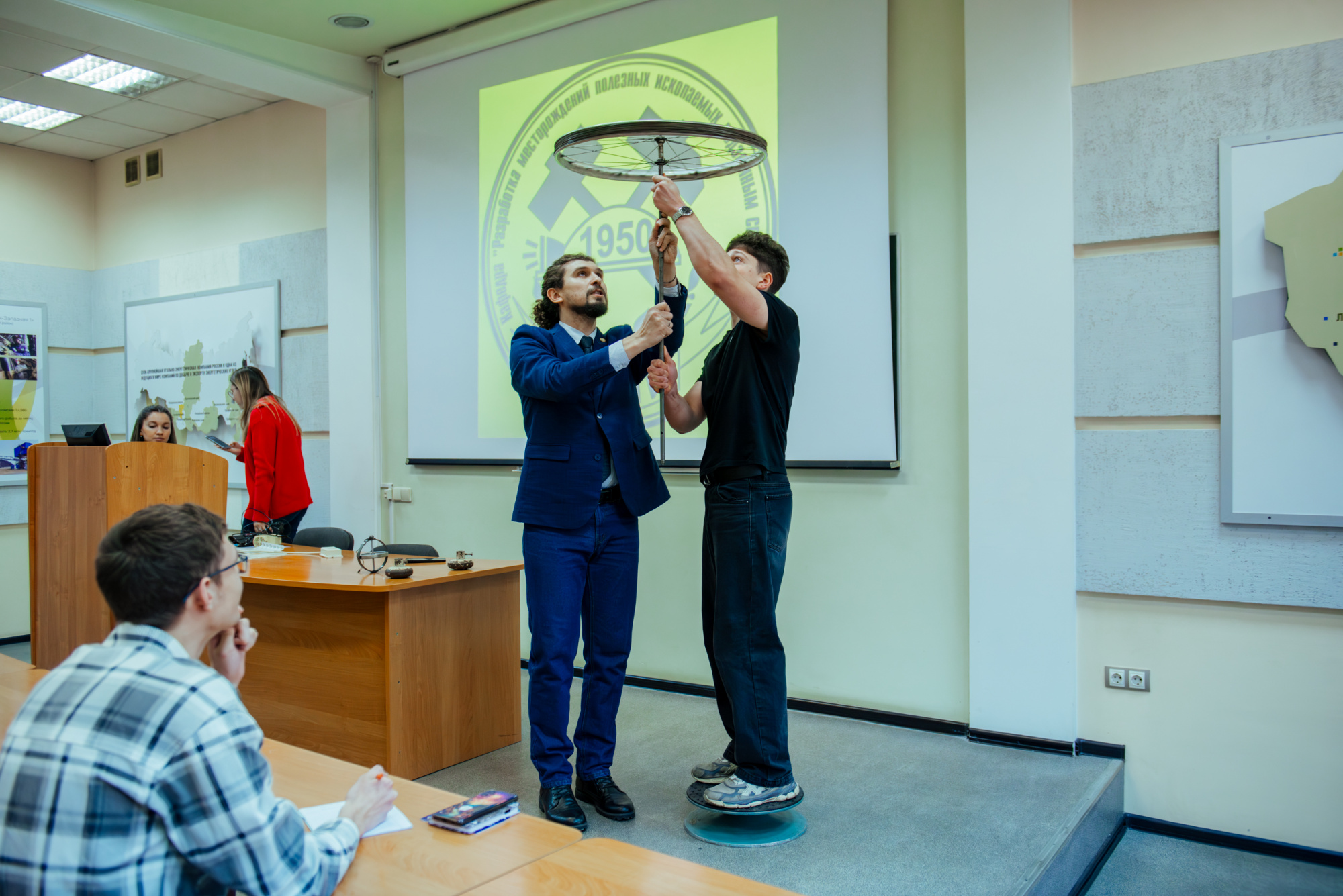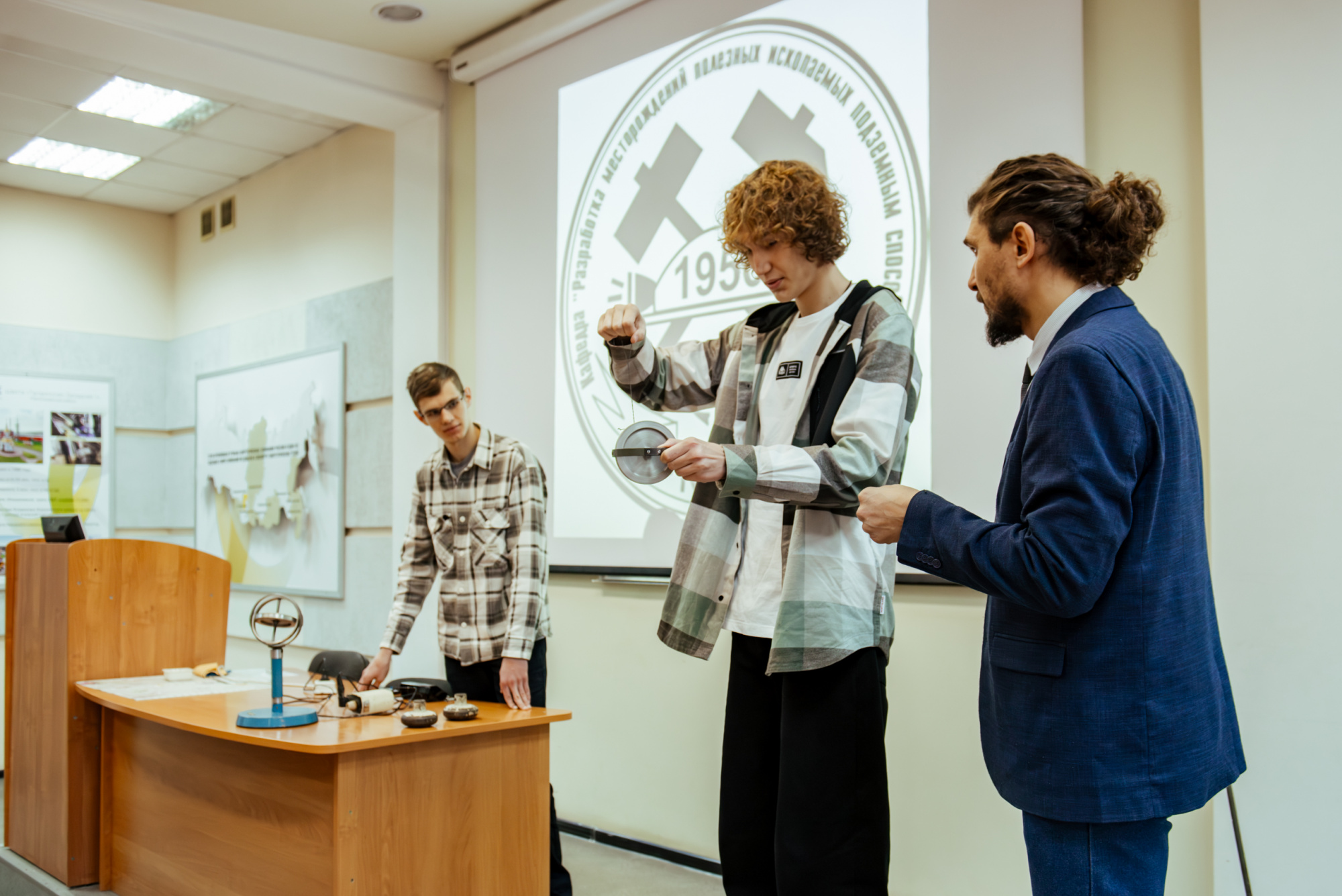 С утра ребята получили зачетки и пропуска – точно такие же, как у студентов. Вооружившись ими, старшеклассники побывали на лекции по физике на тему «Вращательное движение», которую прочитал Евгений Дугинов, доцент кафедры физики горного института. Лектор рассказал об основных законах по теме, и в подтверждении теоретической базы продемонстрировал несколько опытов с использованием специальных приборов. Поучаствовали в них и новоиспеченные «студенты».