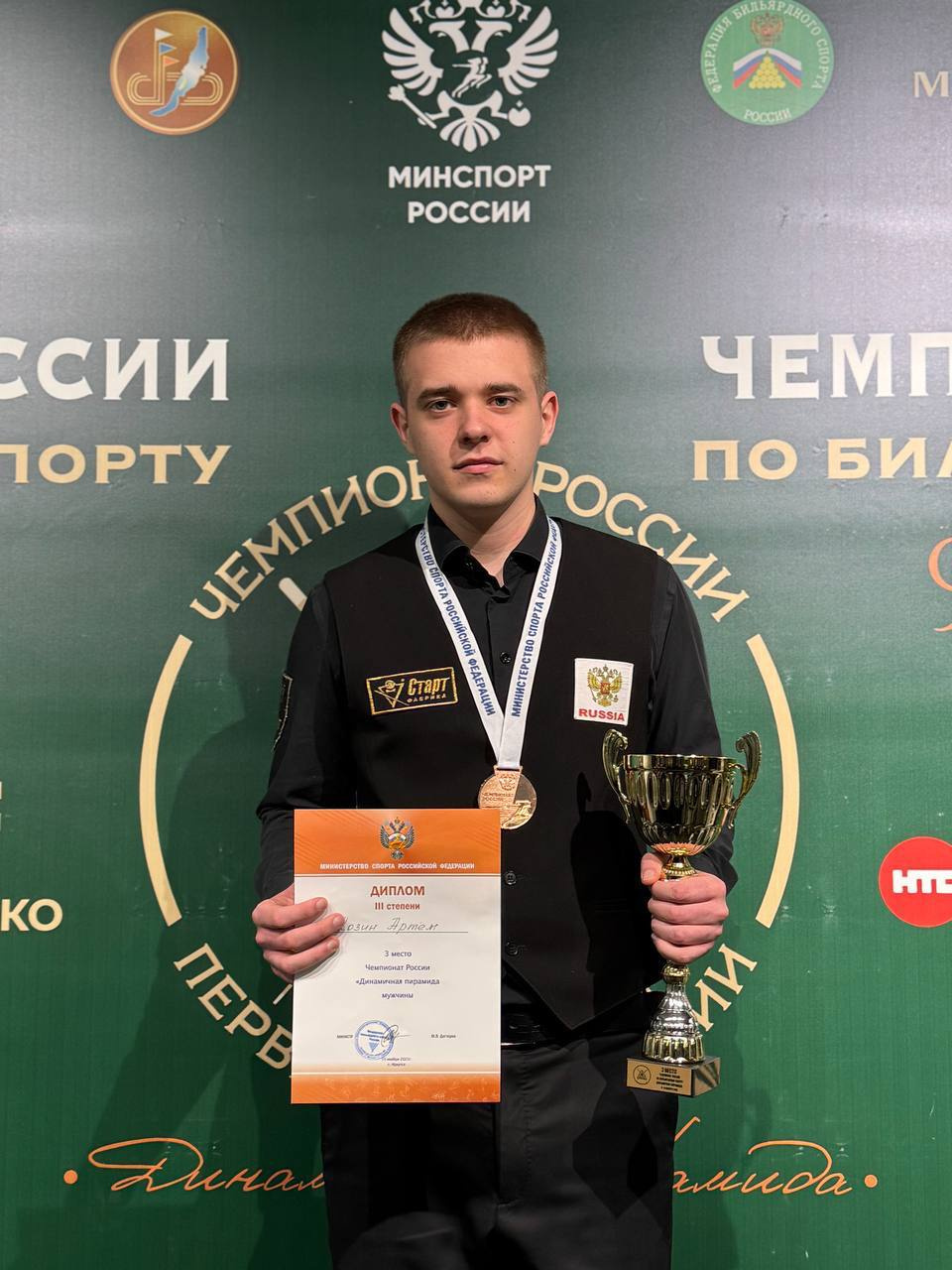 Студент института экономики и управления Артем Козин стал бронзовым призером Чемпионата России по бильярдному спорту в дисциплине «Динамичная пирамида». Соревнования прошли в Иркутске и собрали около 100 сильнейших спортсменов из 24 регионов страны, среди которых мастера и кандидаты в мастера спорта.