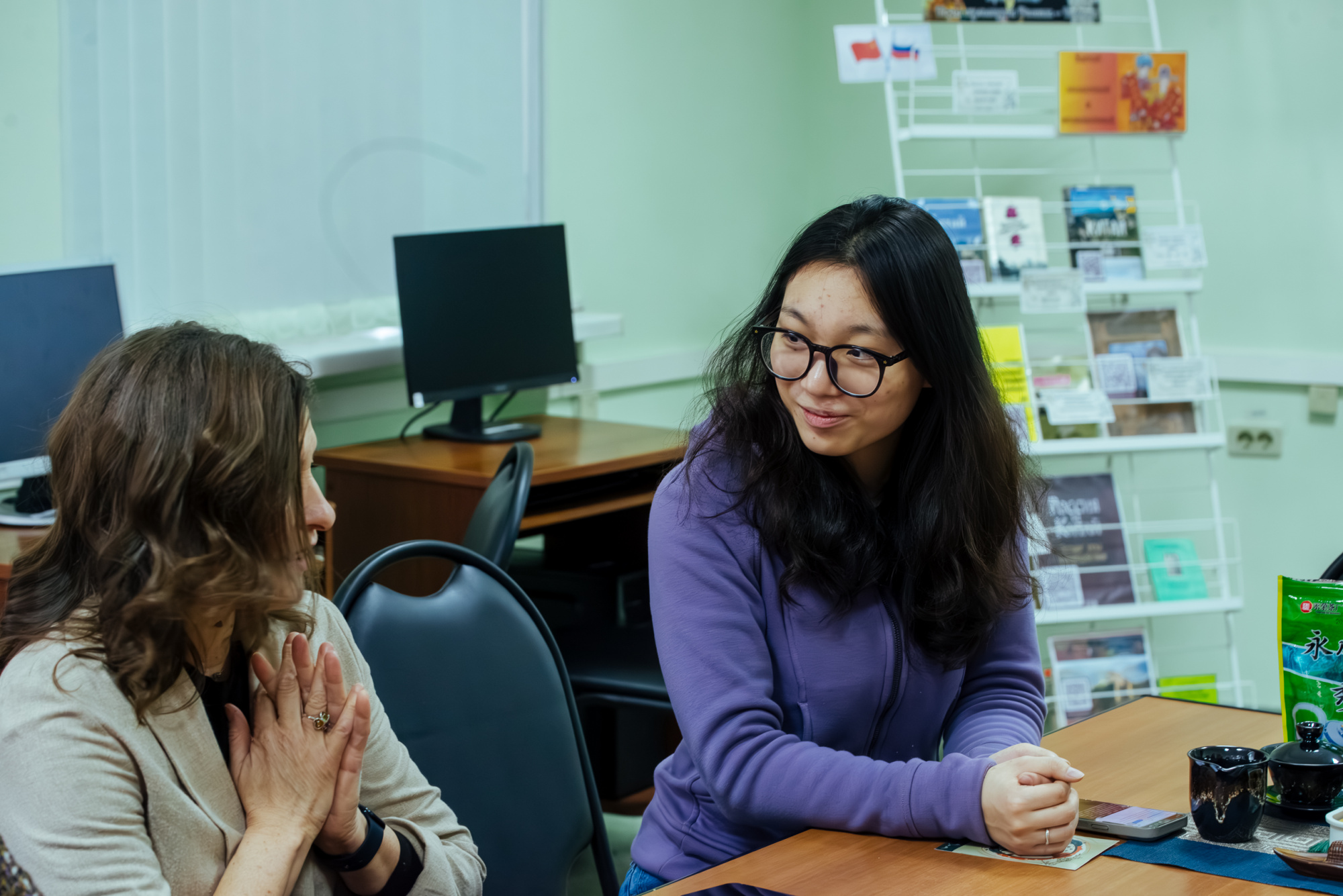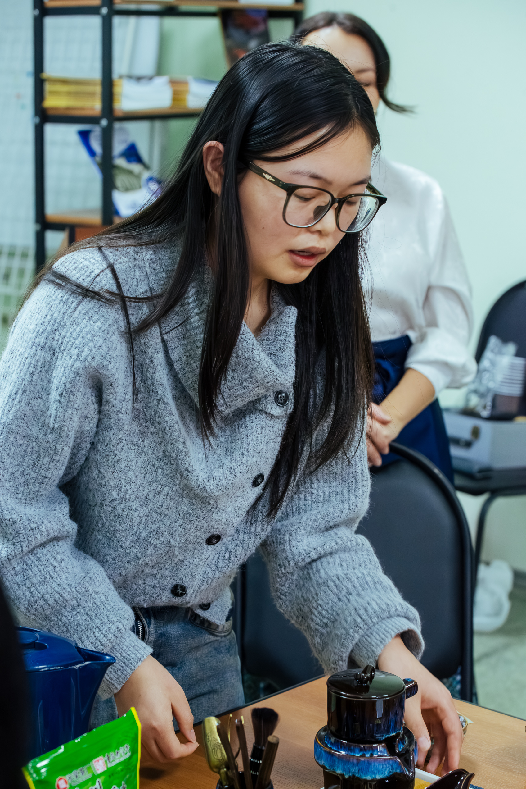 Необычайно тёплая атмосфера окутала всех присутствующих. Студентки третьего курса Пэн Фужун и Чжао Минхун рассказали о чайной культуре своей родной страны, видах чая, правилах заваривания и дегустации. Отметим, что девушки учатся по совместной образовательной программе КузГТУ и ЧУИН «Инженерная защита окружающей среды» в формате «2+2». Первые два года они обучались в китайском университете, а теперь - в Кузбасском политехе.