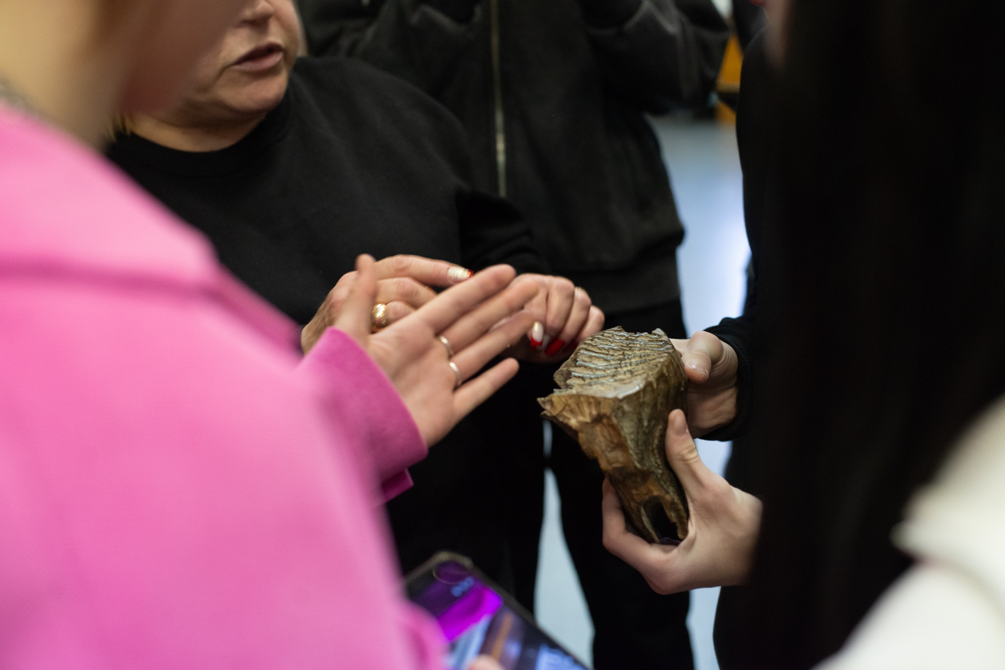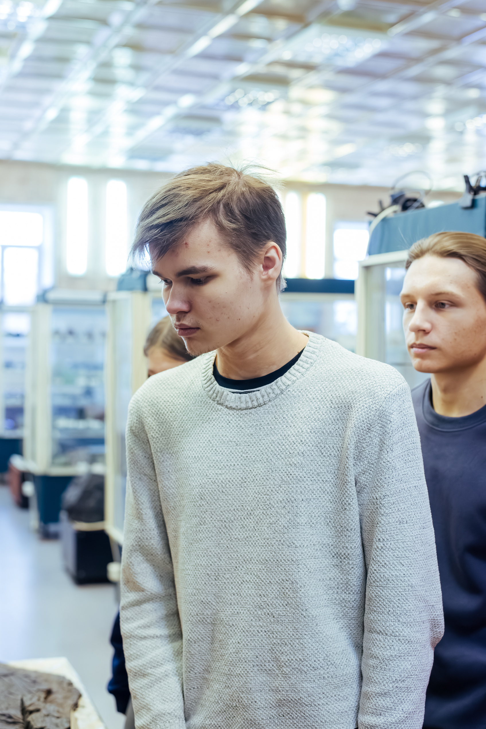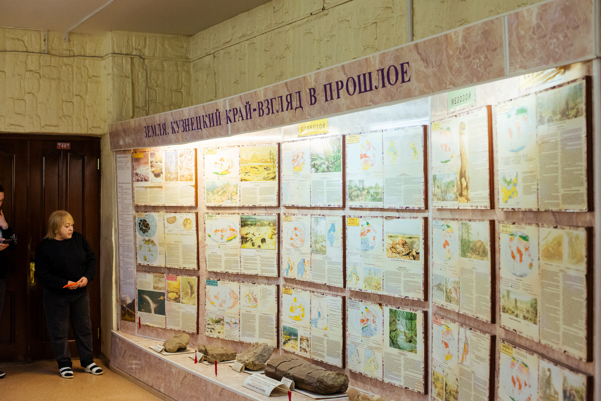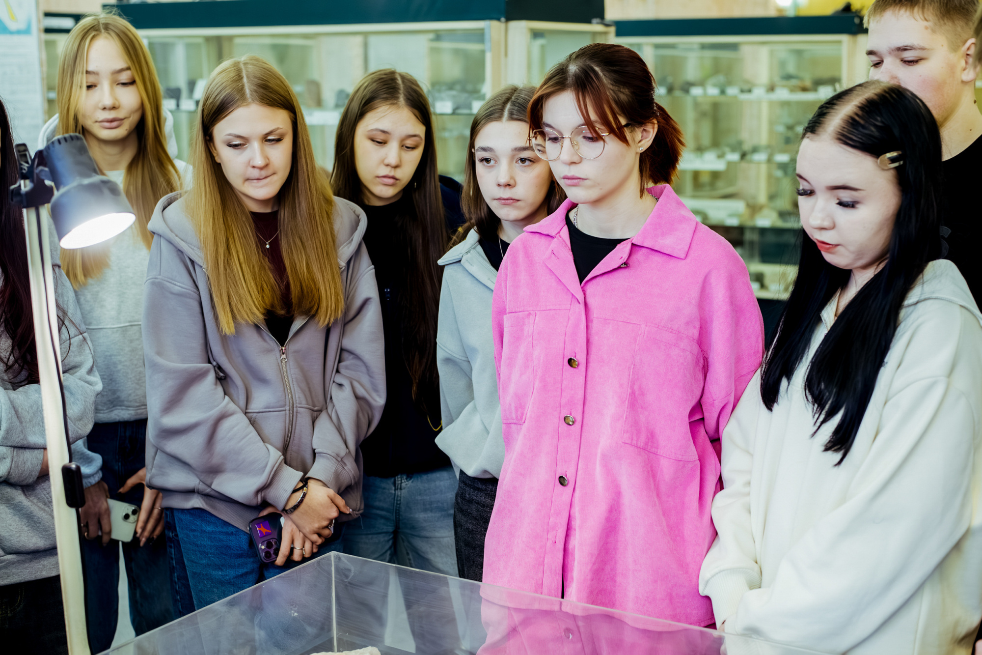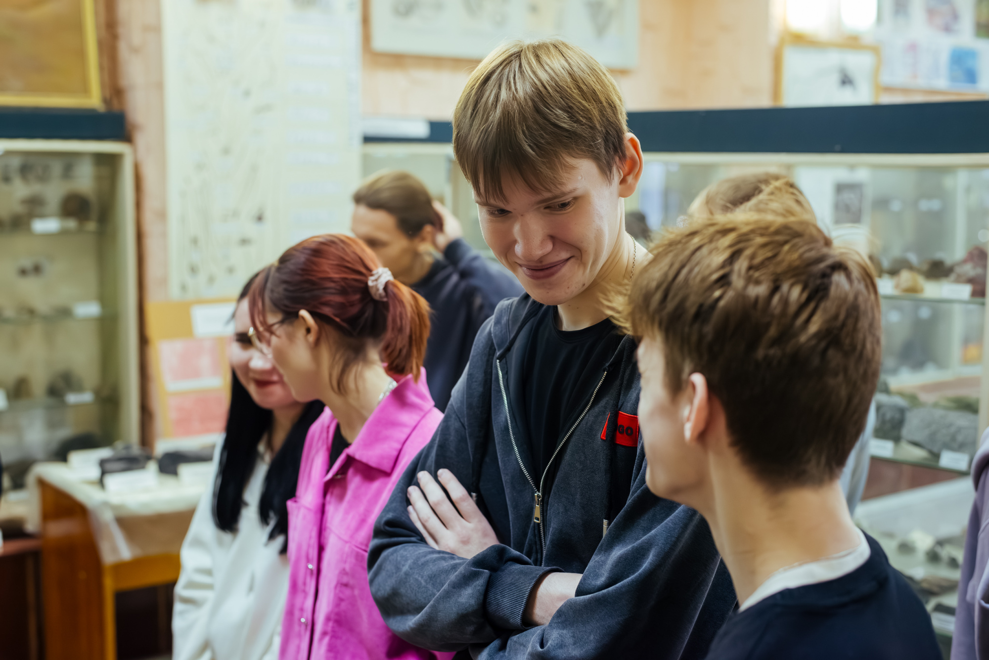 Экскурсия прошла в формате насыщенного обзорного маршрута. Студенты последовательно познакомились с разделами, посвящёнными минеральным ресурсам, геологии и палеонтологии, рассмотрели коллекции горных пород и минералов, узнали о ювелирных камнях и редких формах природных образцов. Отдельное внимание уделили учебной коллекции, где породы и минералы систематизированы по классам и группам. Завершением экскурсии стала экспозиция «Земля. Кузнецкий край. Взгляд в прошлое» по которой можно наглядно проследили этапы формирования континентов и появление различных видов полезных ископаемых — от древних геологических процессов до современных недр региона.
