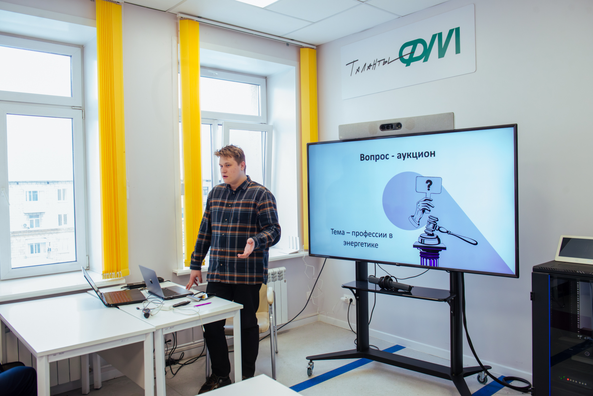 Заместитель директора института энергетики Валерий Боровцов рассказал ребятам о направлениях подготовки института и профессиональных позициях, которые могут занимать его выпускники на предприятиях после окончания университета. Затем ребята сыграли в интерактивный энергетический квиз в формате телевизионного шоу «Своя игра», его провел Ярослав Авдеев, магистрант института энергетики, лаборант Инженерной школы «УникУм» и молодой педагог-наставник Центра талантов «Кемерово». Он предложил школьникам проверить свои знания, ответив на вопросы по темам, связанным с работой электростанций, энергоресурсами ТЭК, видами энергии и энергосистемой Кузбасса.