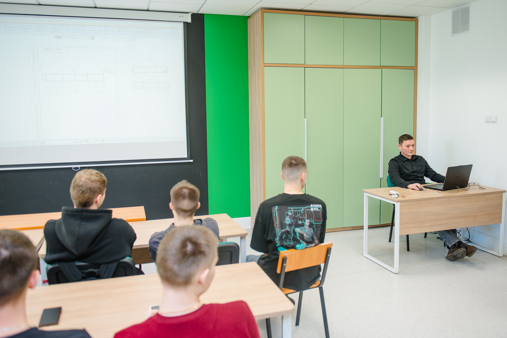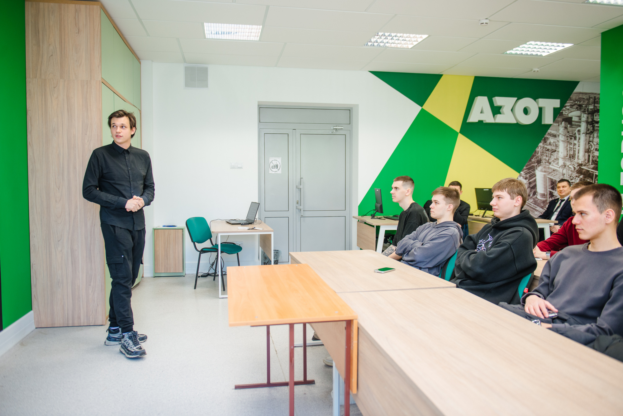 Одногруппник Захара Никита Завалко заключил договор с КАО «Азот», студент работает стажёром-технологом в инженерно-конструкторском центре, где выполняет чертежи стандартных деталей. Студентам третьего курса он показал, как сделать в программе «КОМПАС-3D» модель шпильки — цилиндрического стержня с резьбой, который используется как крепежная деталь в автомобилях.