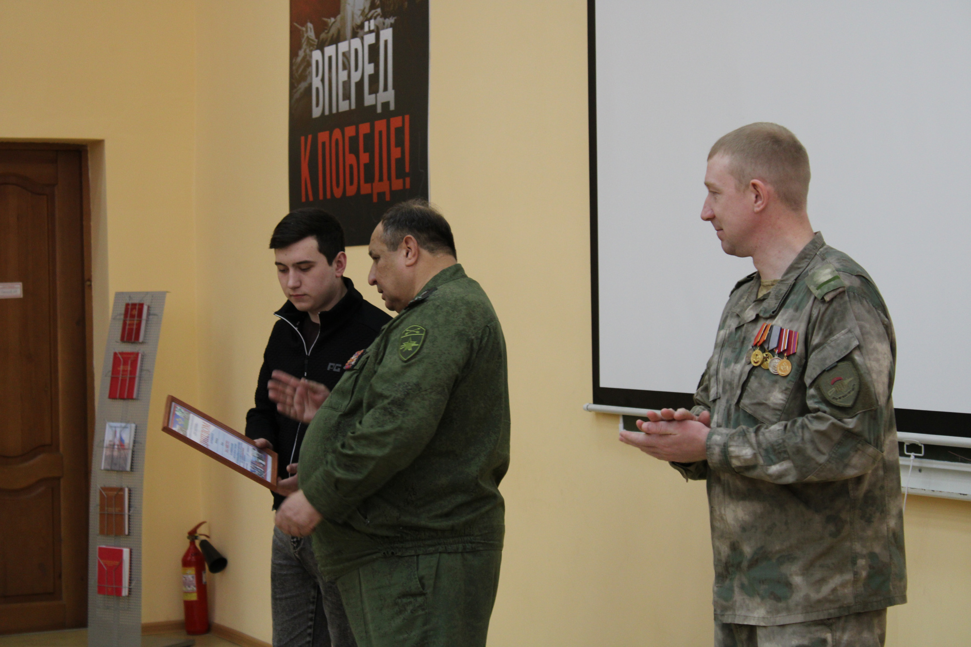 Кульминацией встречи стало торжественное вручение диплома победителя соревнований по стрельбе из пневматической винтовки студенту КузГТУ - сыну участника специальной военной операции Илье Воевода. В присутствии почётных гостей руководство центра поздравило Илью с победой.
