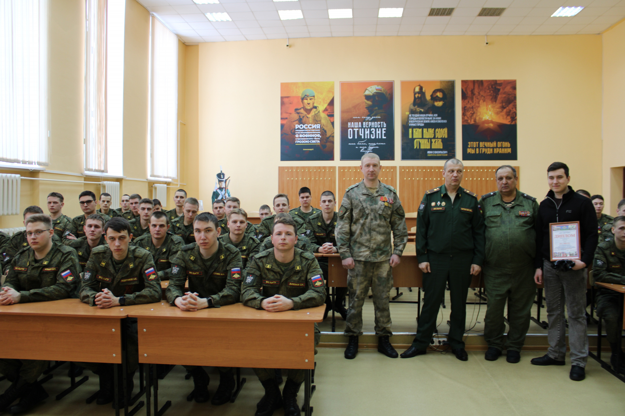 В завершение представители Росгвардии поздравили руководство и студентов Военного учебного центра с Днём защитника Отечества и пожелали здоровья, стойкости и профессиональных успехов. Встреча завершилась общей фотографией на память.