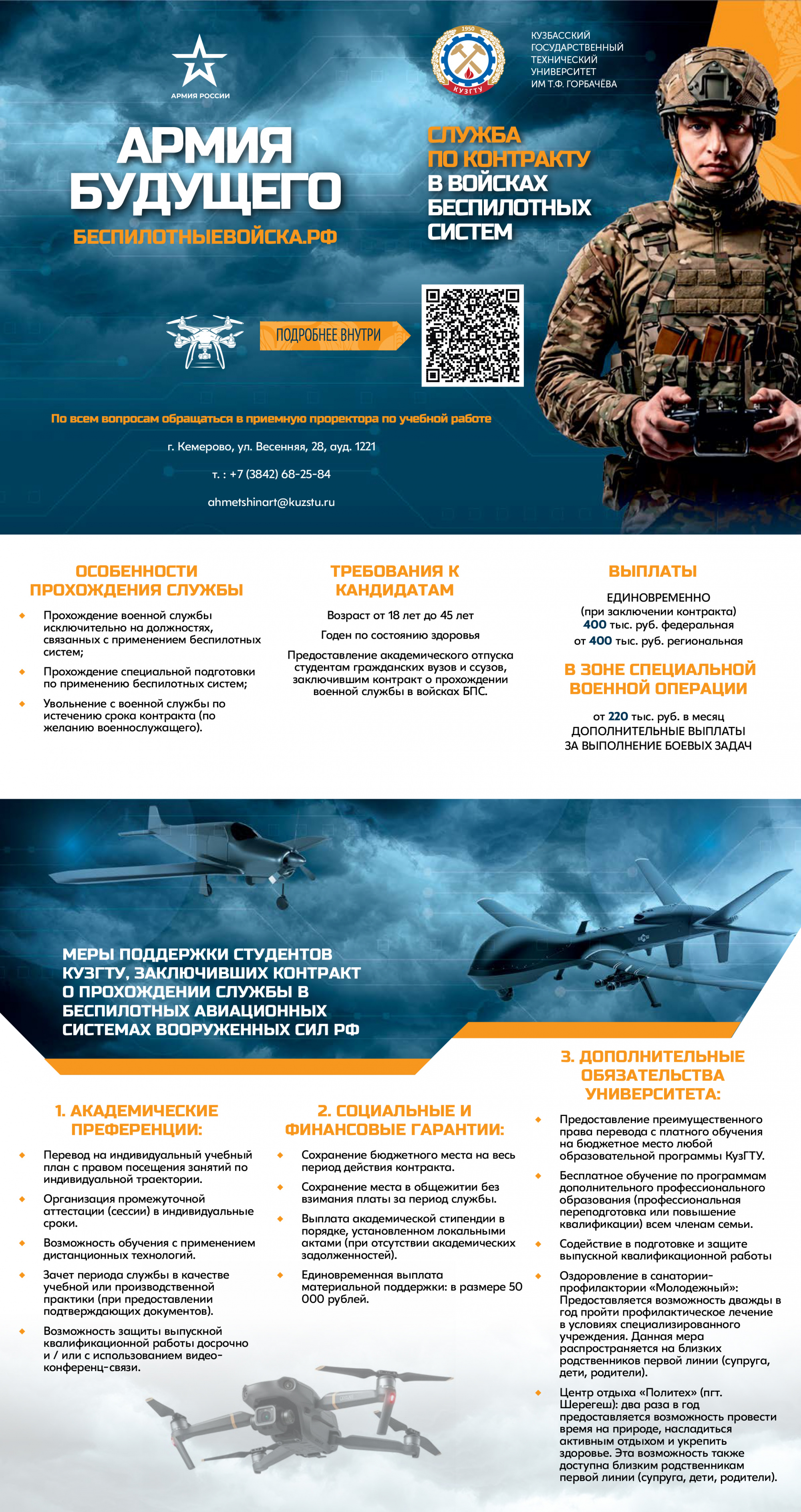 В Кузбасском государственном техническом университете утвердили меры поддержки студентов, заключивших контракт о прохождении службы в беспилотных авиационных системах Вооруженных Сил РФ.