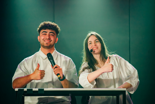 А мы ждем выступления третьекурсника Ильи Белика – известного героя сцены. Илья – настоящий человек-оркестр: он играет на гитаре, баяне и фортепиано.