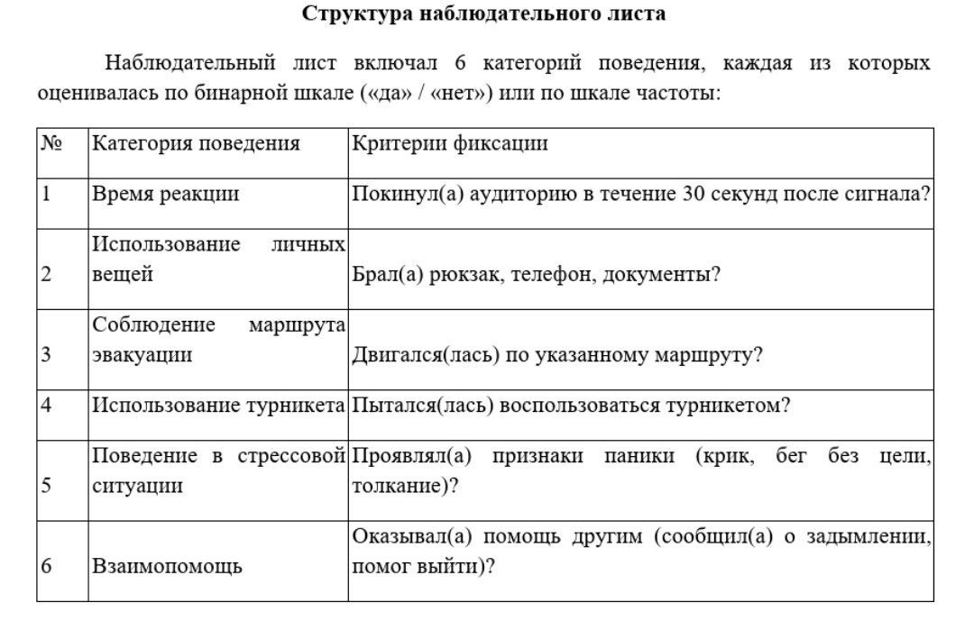 Второкурсница провела эксперимент среди своих одногруппников и студентов первого курса СПО. Чтобы получить объективную картину, Варвара использовала сразу четыре метода: анкетирование, тестирование, наблюдение во время плановой учебной эвакуации и фокус-группу.