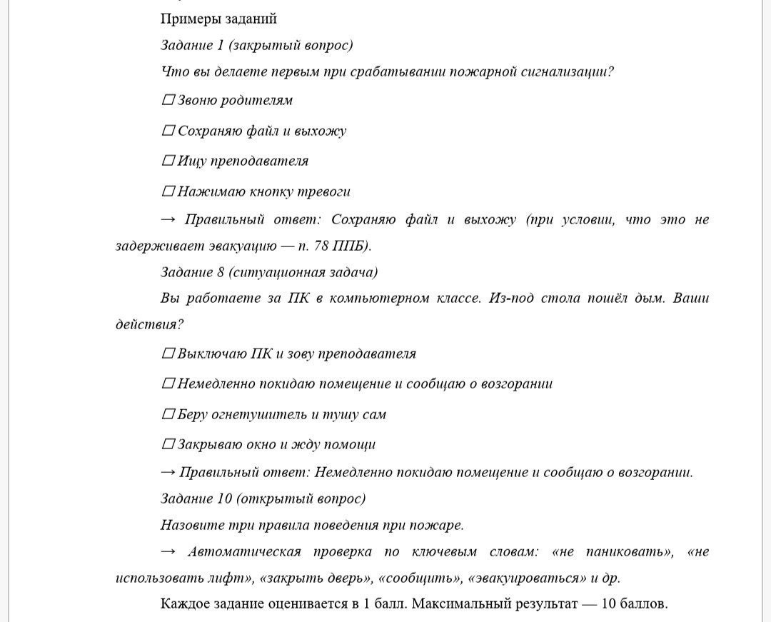 Анкета из двенадцати вопросов помогла понять субъективное отношение студентов к пожарной безопасности и мотивацию. Тест, включающий закрытые вопросы, задания на соответствие и ситуационные кейсы, дал объективную оценку знаний. Фокус-группа с шестью студентами позволила выявить глубинные причины низкой вовлечённости – оказалось, что многие считают тему «не своей», потому что не видят связи с будущей профессией бухгалтера.