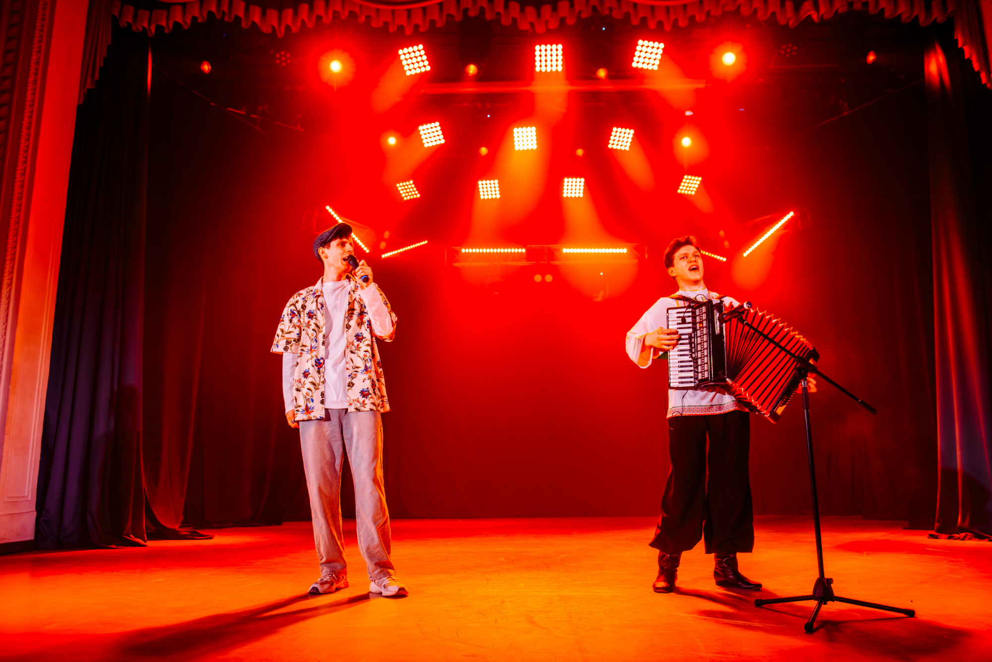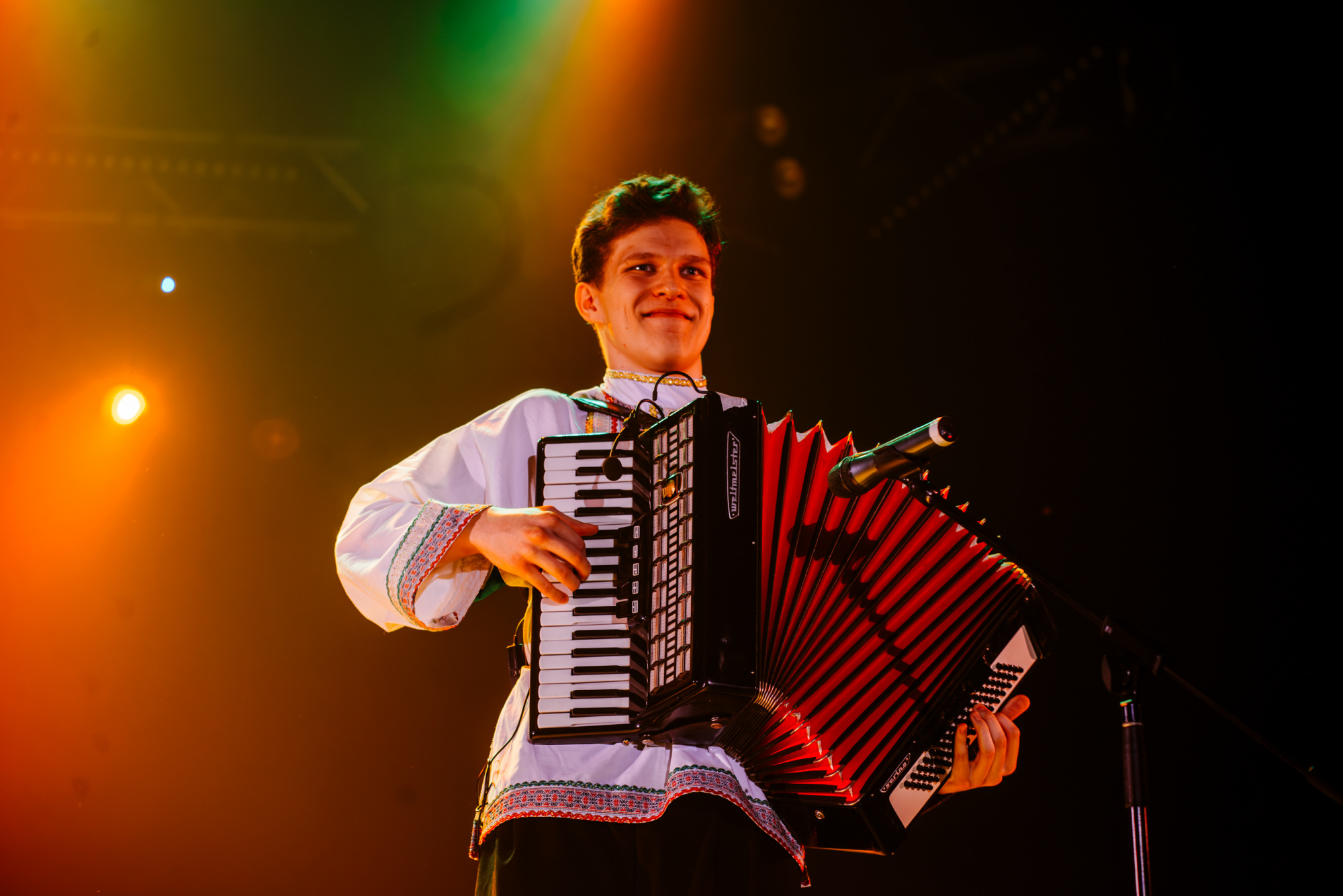 Неожиданным, но очень тёплым моментом стало выступление аккордеониста. Роман Левшенко вышел на сцену с инструментом, и полились знакомые с детства мелодии. Зал слушал, затаив дыхание - настолько чистой и искренней была музыка.