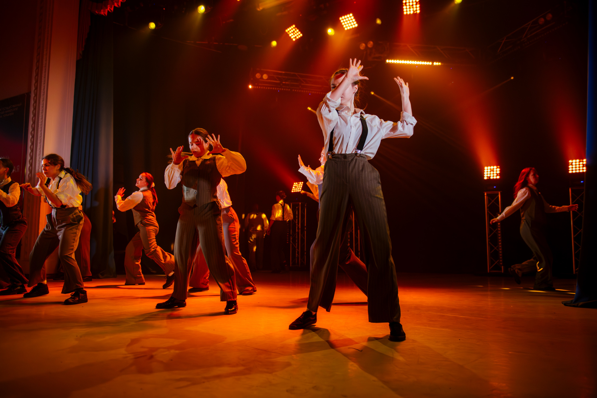 Сцена празднования после отъезда ревизора сначала возвращает лёгкость: джаз, движение, ощущение освобождения. Но затем буквально несколькими репликами концерт показывает обратную сторону этой свободы. Нет отопления, нет еды, нет электричества — потому что всё, что раньше обеспечивало жизнь города, давно уступило место эстетике и красивым пространствам. Реплика о том, что художник должен быть голодным и холодным, сначала звучит как ещё один удачный смеховой момент, но через секунду становится понятно, насколько точно она попадает в саму идею концерта.