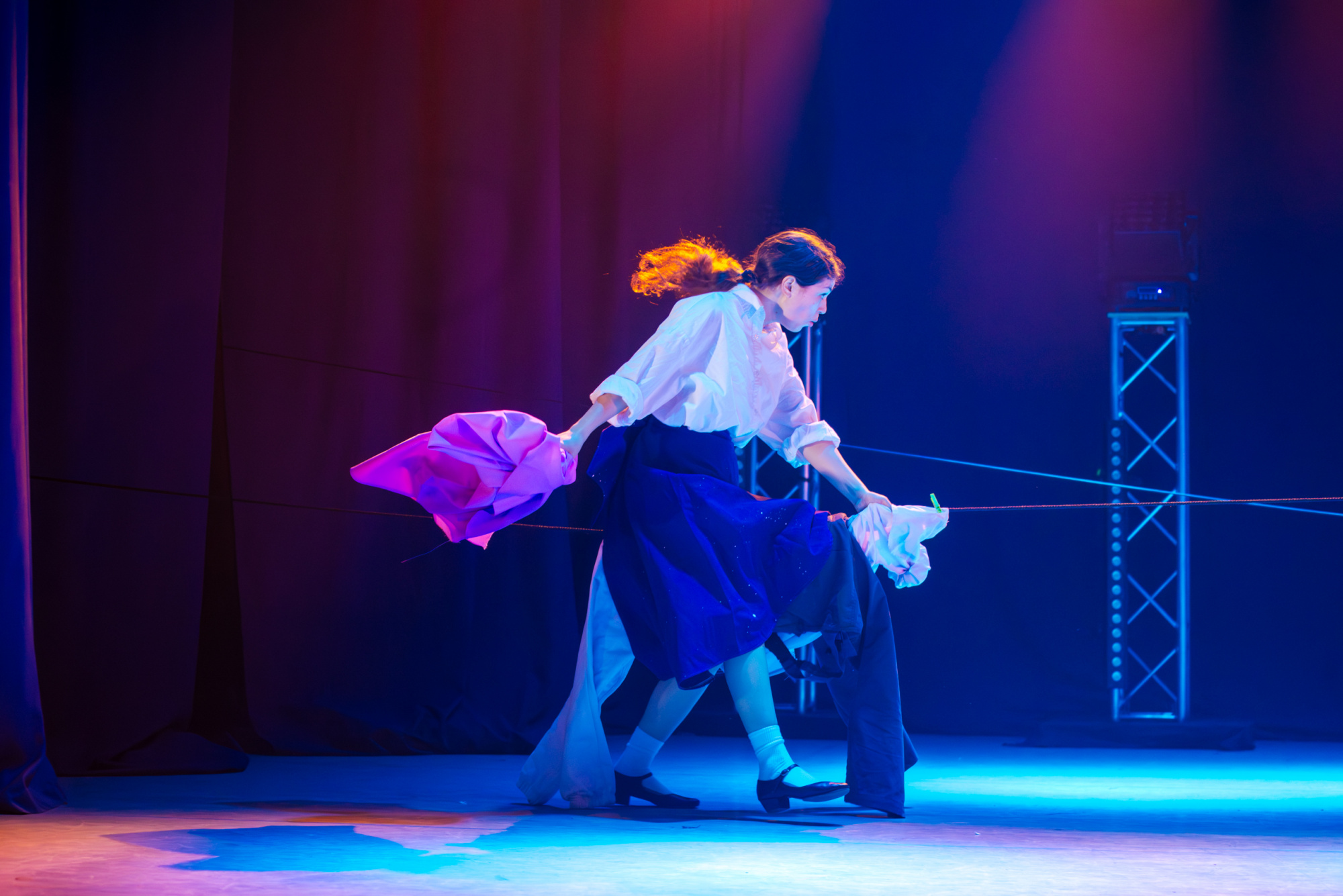 Особенно удачно это раскрывается в сценах, где герои начинают заново распределять роли. И здесь постановка снова работает через юмор. Художник становится архитектором, дизайнеры начинают шить для рабочих, танцоры идут к станку, актёр получает роль вахтёра — и всё это выглядит не как отказ от творчества, а как его естественное продолжение в другой среде.