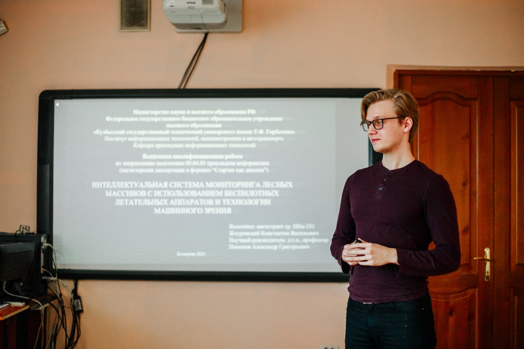 В секции «Производственная, пожарная безопасность» первое место заняли аспирант направления «Компьютерные науки и информатика» Константин Жмуровский и магистрант направления «Прикладная информатика» Александр Тютиков. Они представляли исследование на тему «Обеспечение пожарной безопасности лесных массивов с использованием беспилотных летательных аппаратов и технологии машинного зрения». Научный руководитель – заведующий кафедрой прикладных информационных технологий Александр Пимонов.