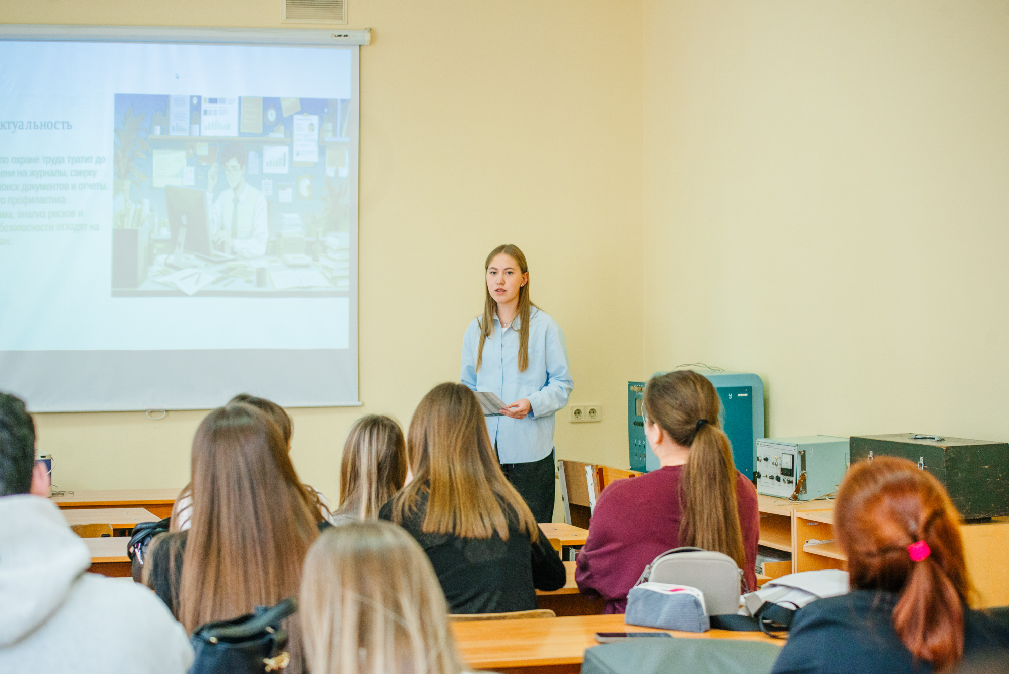 Именно эту ситуацию студентка и рассматривает в своей работе, анализируя, как автоматизированное рабочее место может изменить организацию труда инженера по охране труда и освободить время для действительно важных задач.