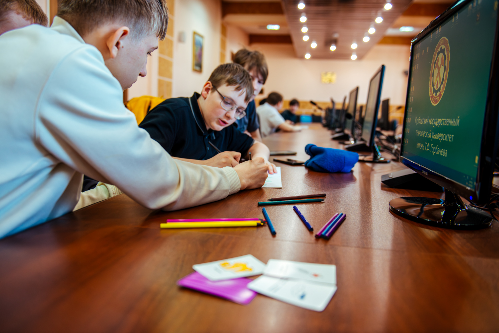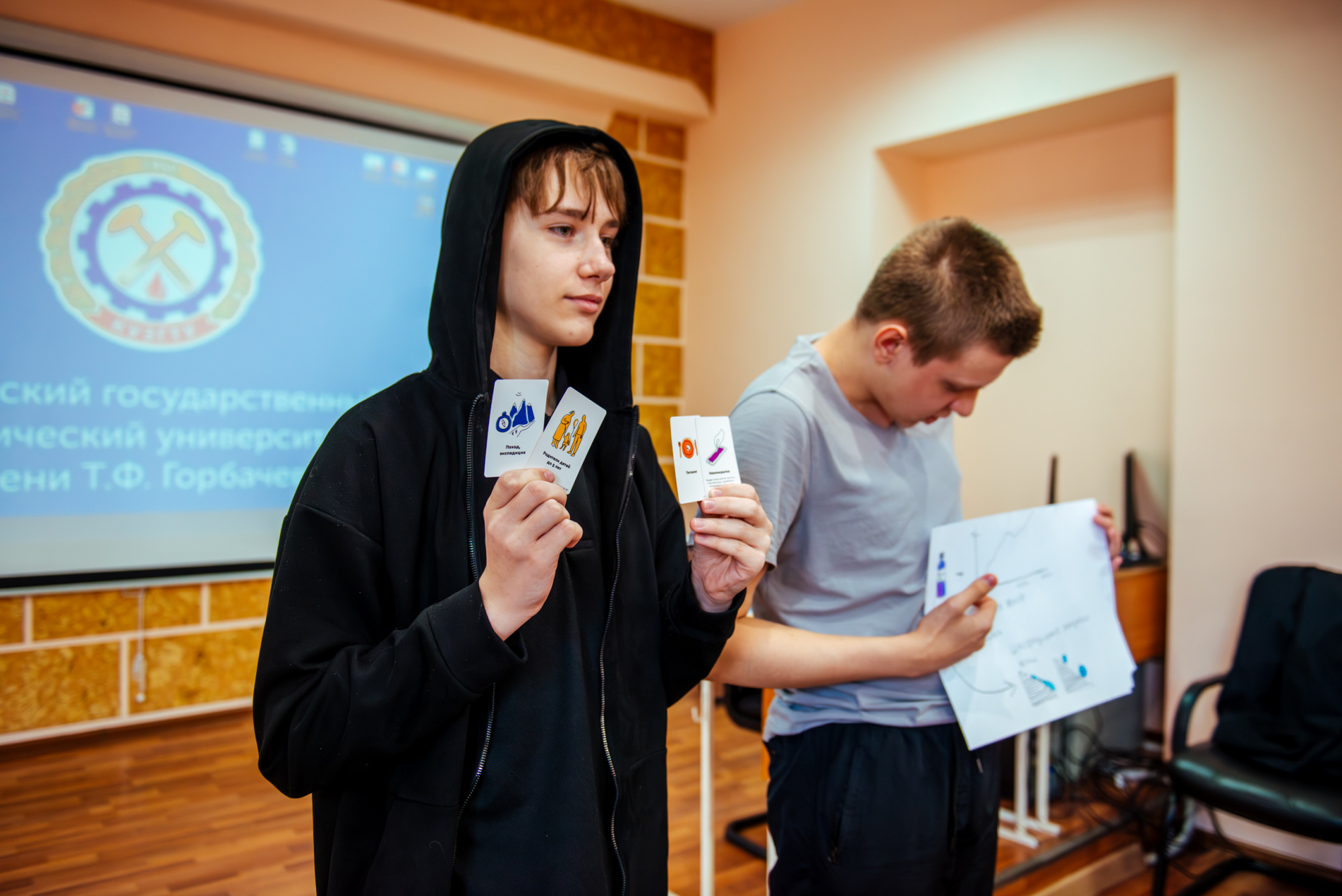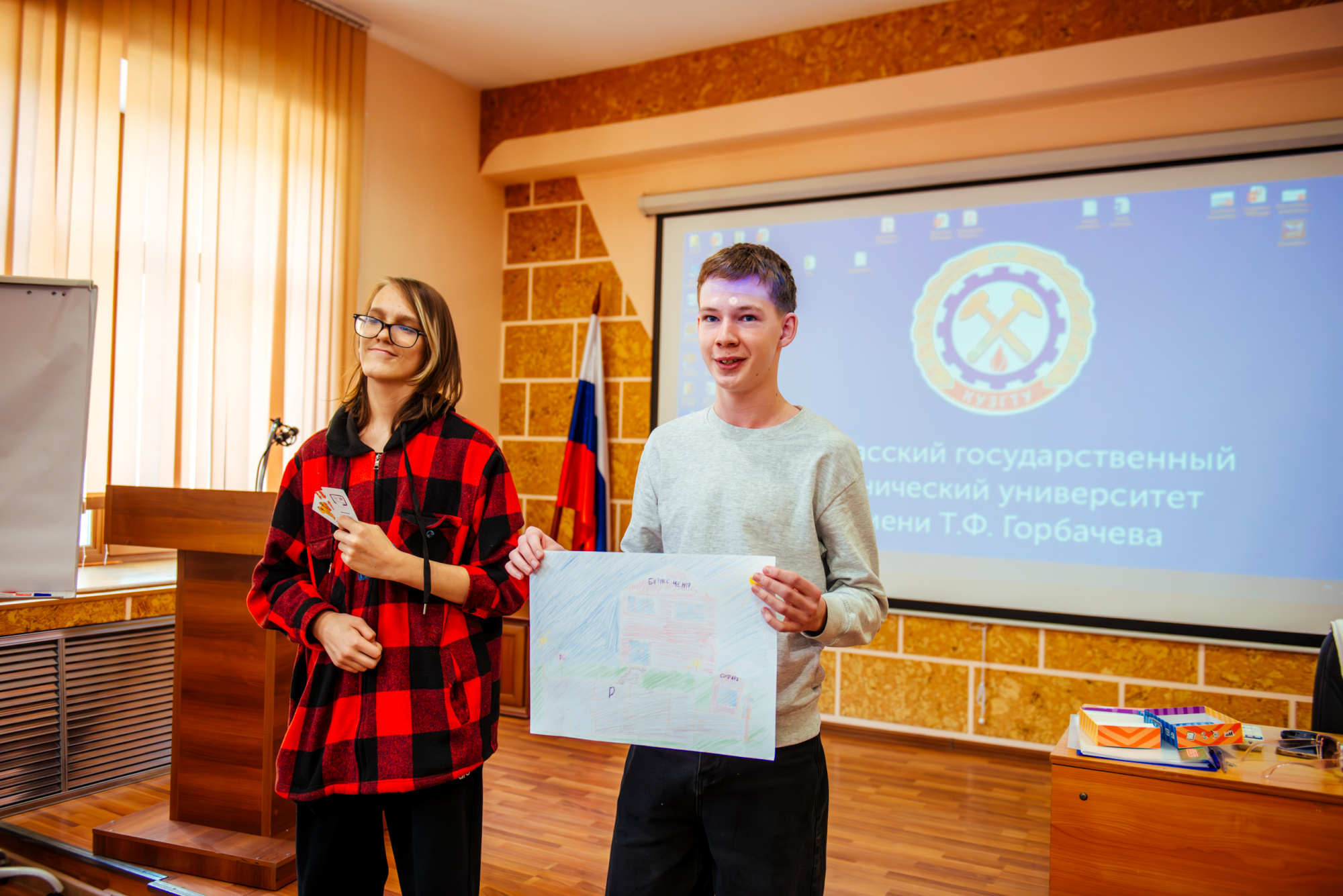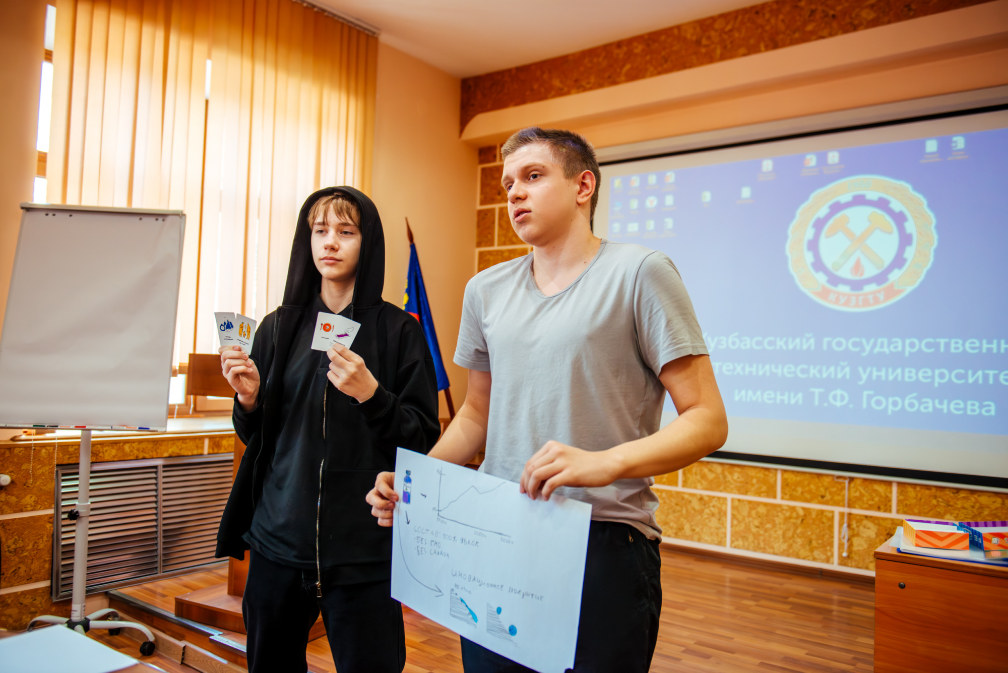 Вместе со старшим преподавателем кафедры производственного менеджмента института экономики и управления Русланом Фаляховым школьники «придумывали» свой стартап для решения актуальной проблемы с использованием современных технологий. Планы проектов они изобразили в виде рисунков и схем, а потом защитили их.