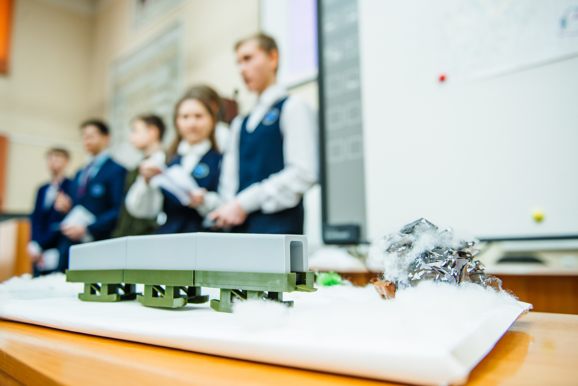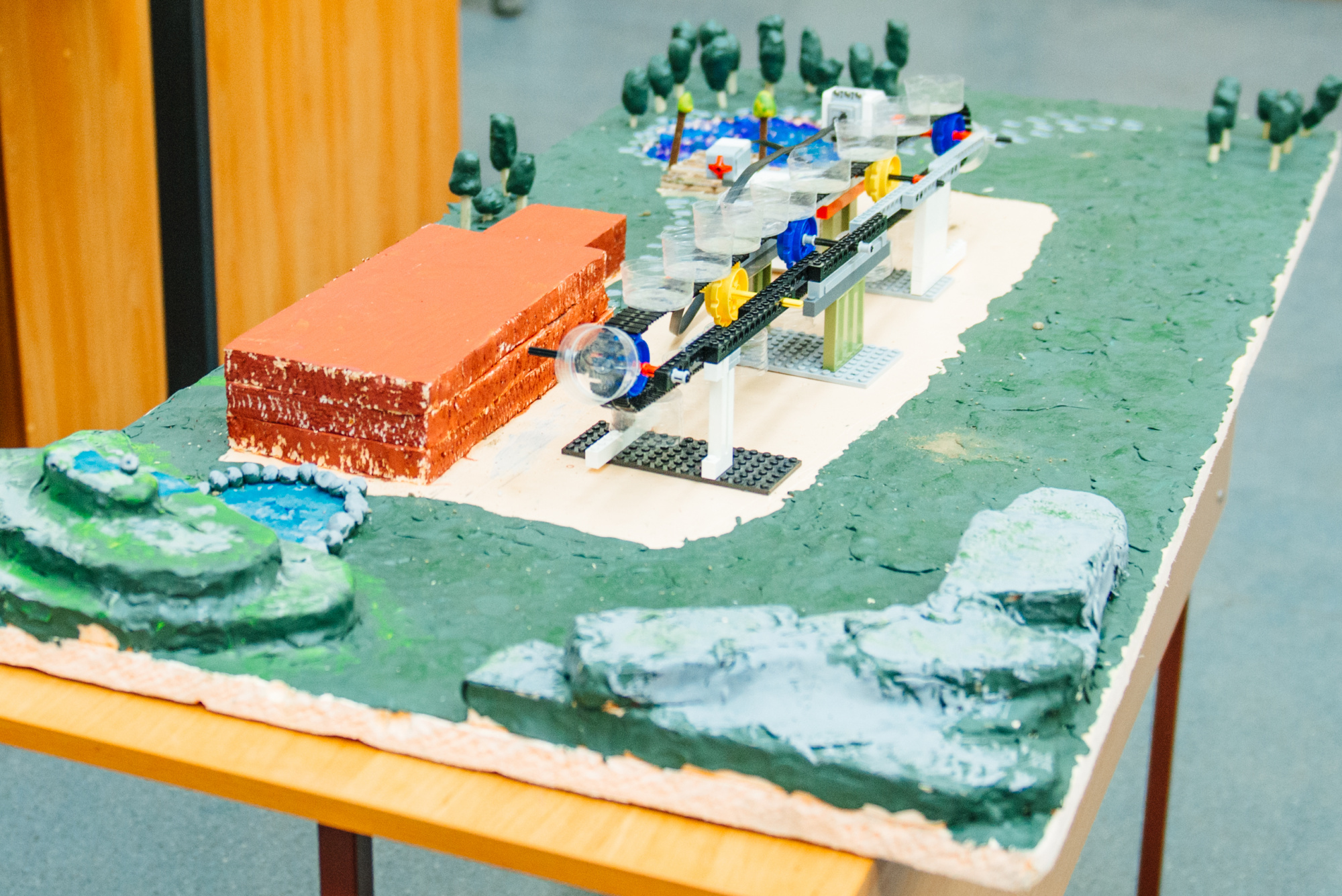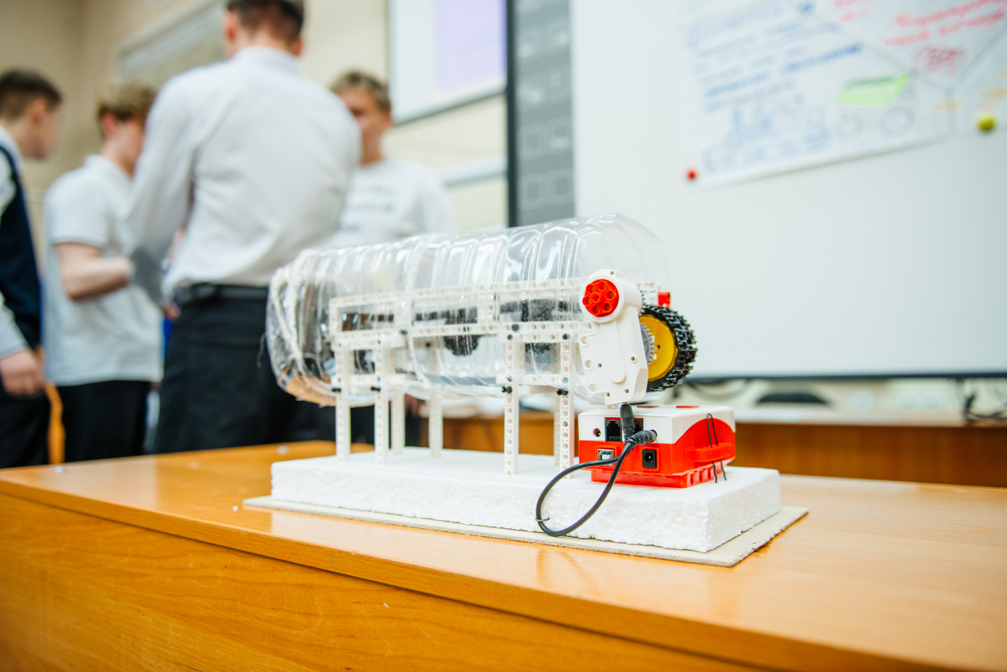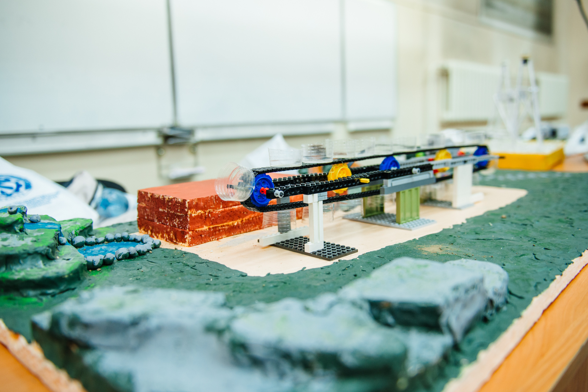 Команда также представила действующий макет. Он выполнен из доступных материалов: конвейерная лента собрана из элементов конструктора «Клик», двигатель – из того же набора, питание обеспечивает аккумулятор. Основа конструкции выполнена из лёгкого упаковочного пенопласта с пластиковым каркасом.