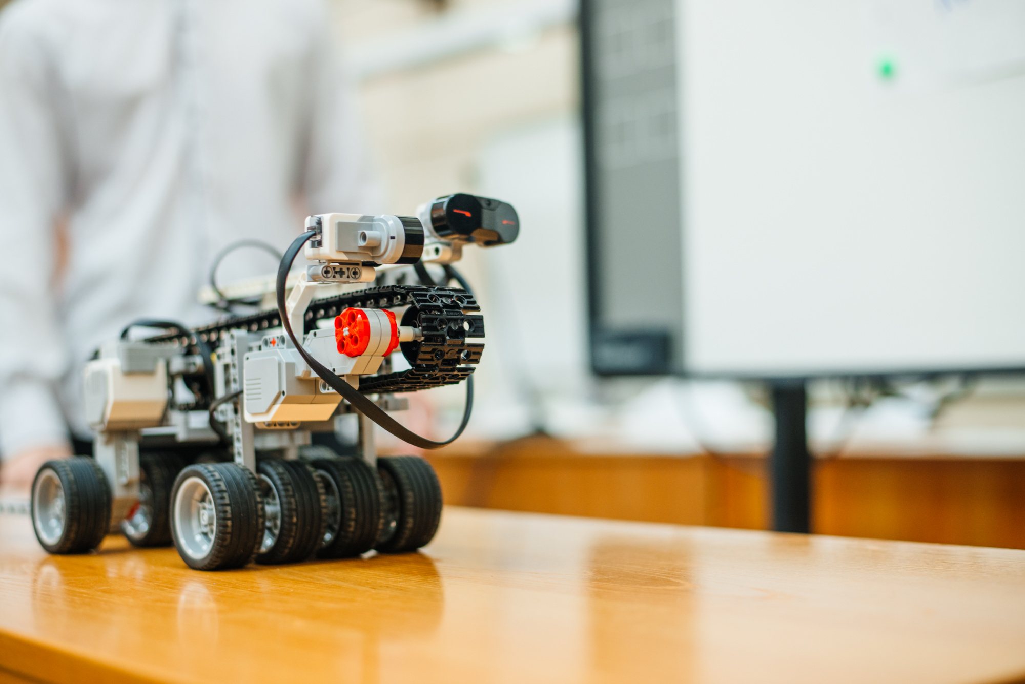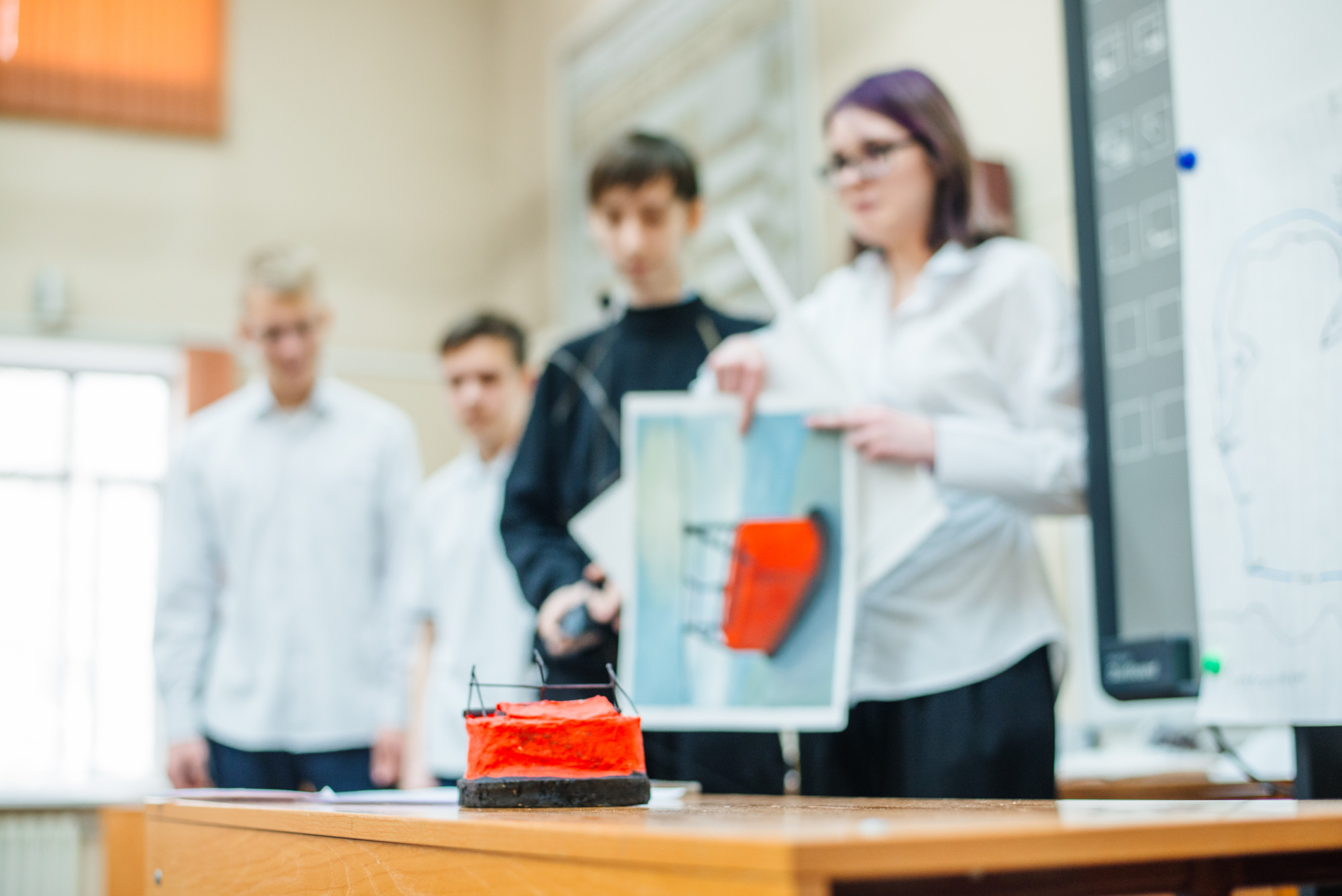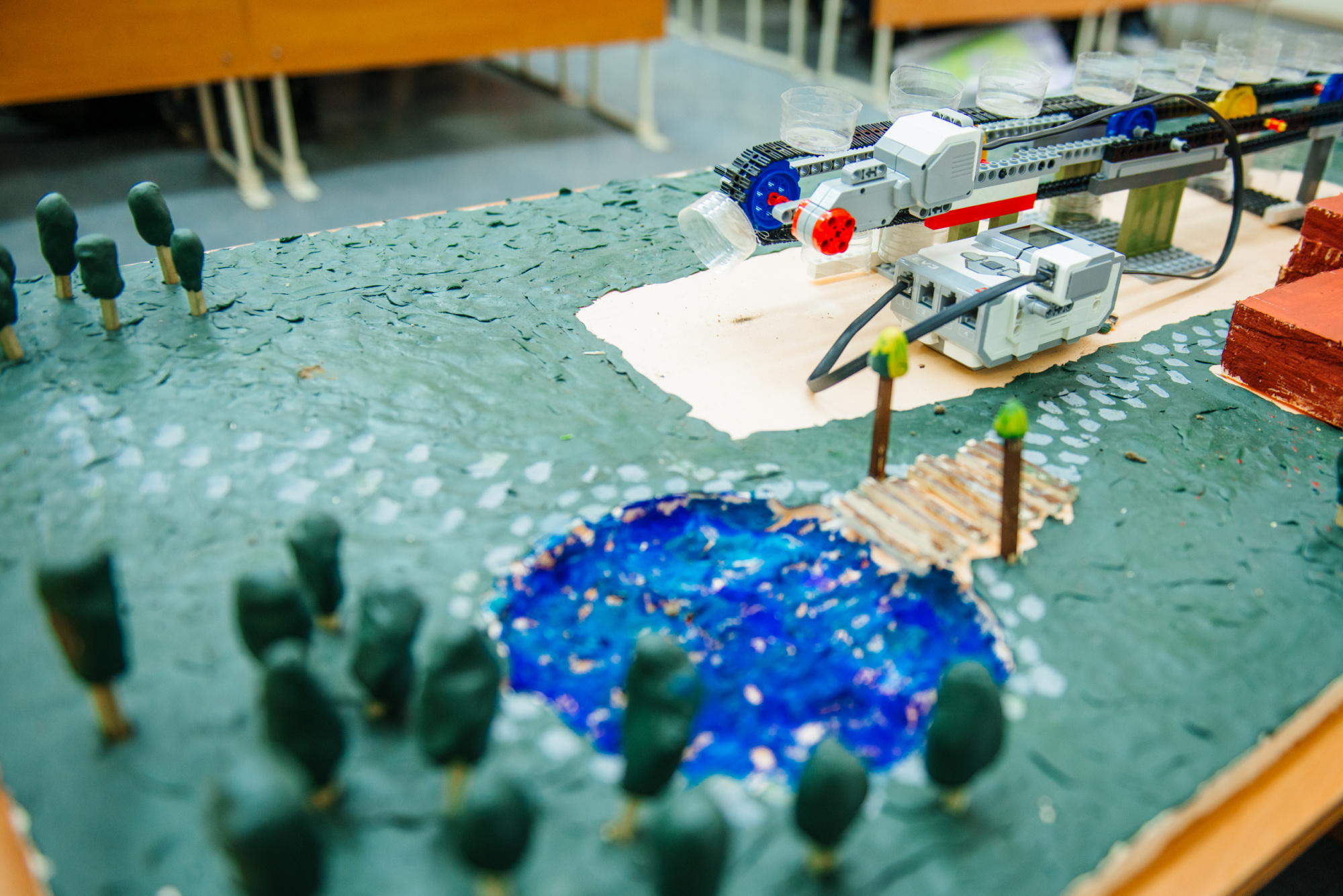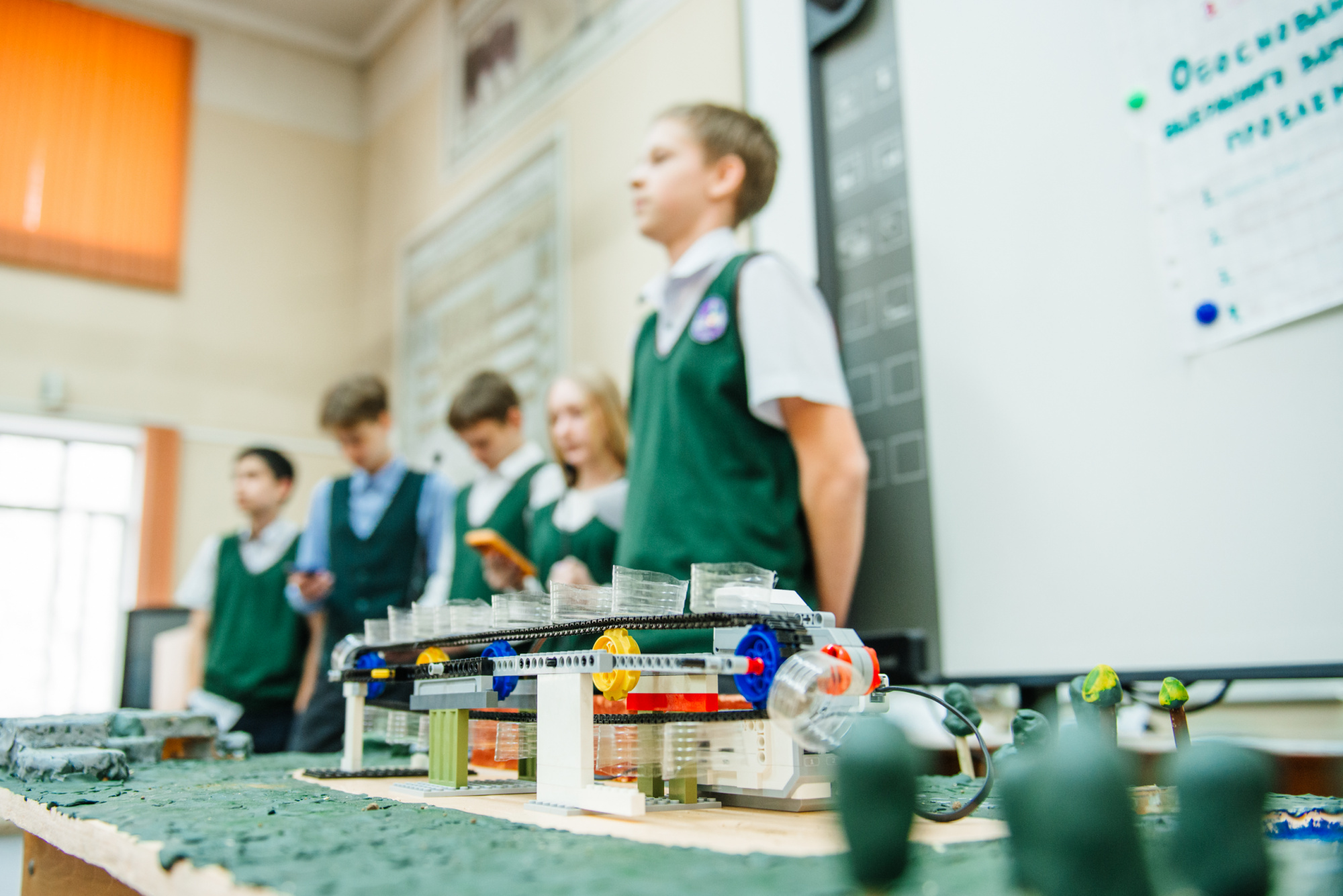 Команда также представила действующий макет. Он выполнен из доступных материалов: конвейерная лента собрана из элементов конструктора «Клик», двигатель – из того же набора, питание обеспечивает аккумулятор. Основа конструкции выполнена из лёгкого упаковочного пенопласта с пластиковым каркасом.