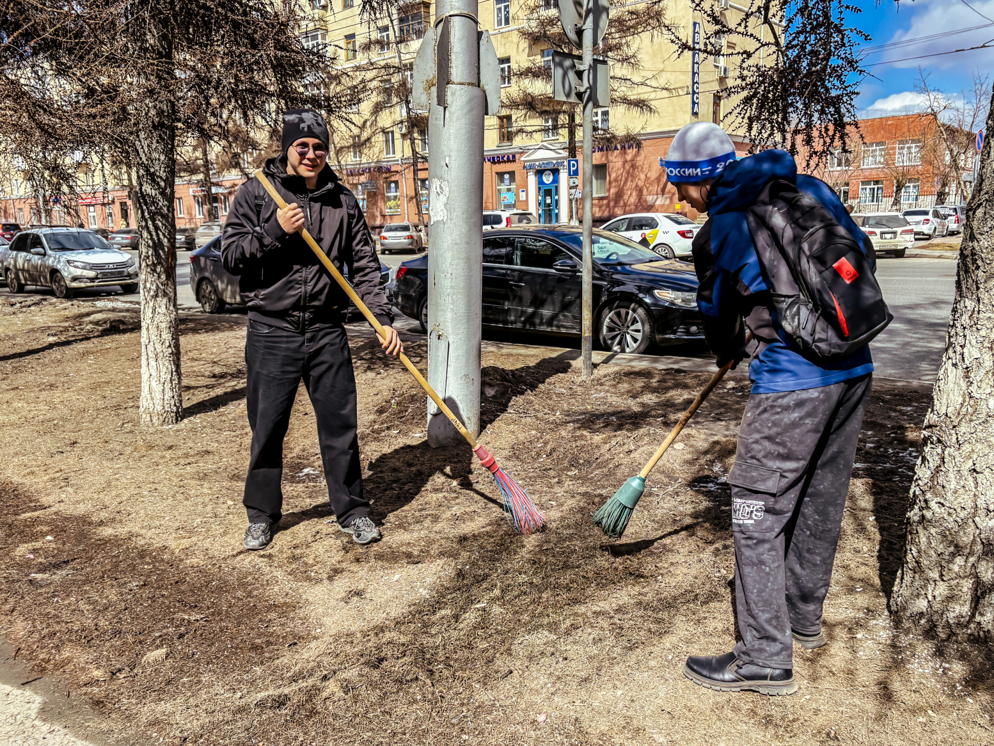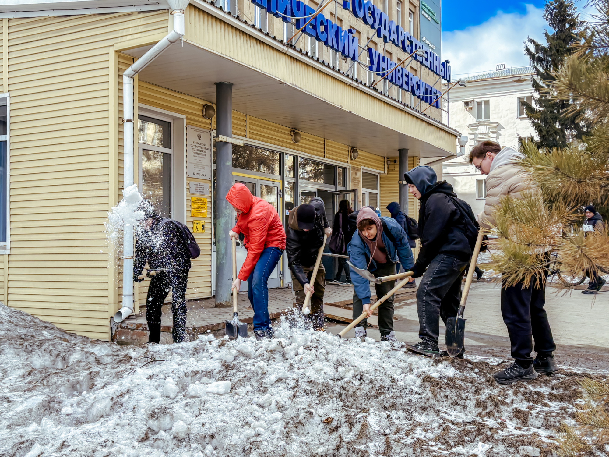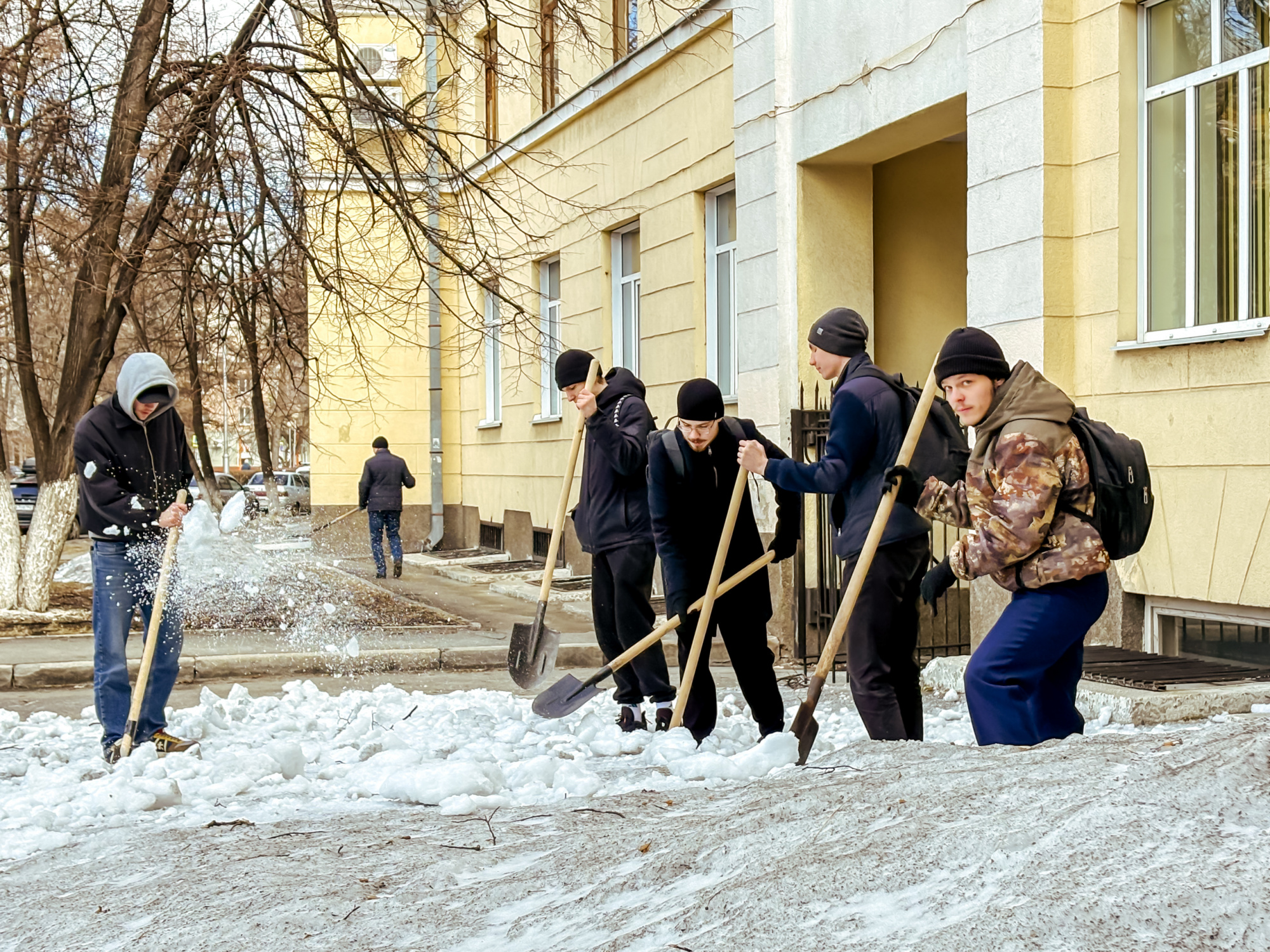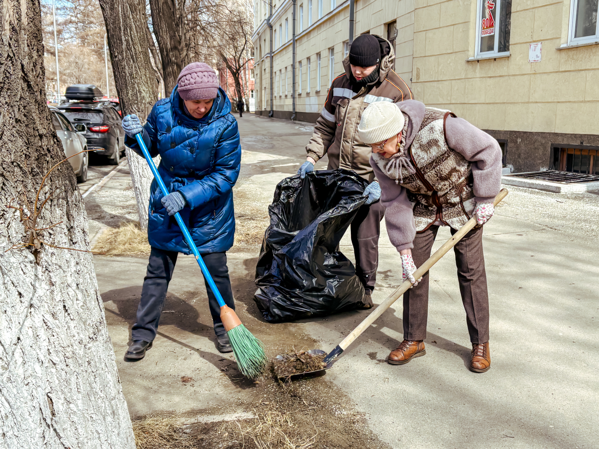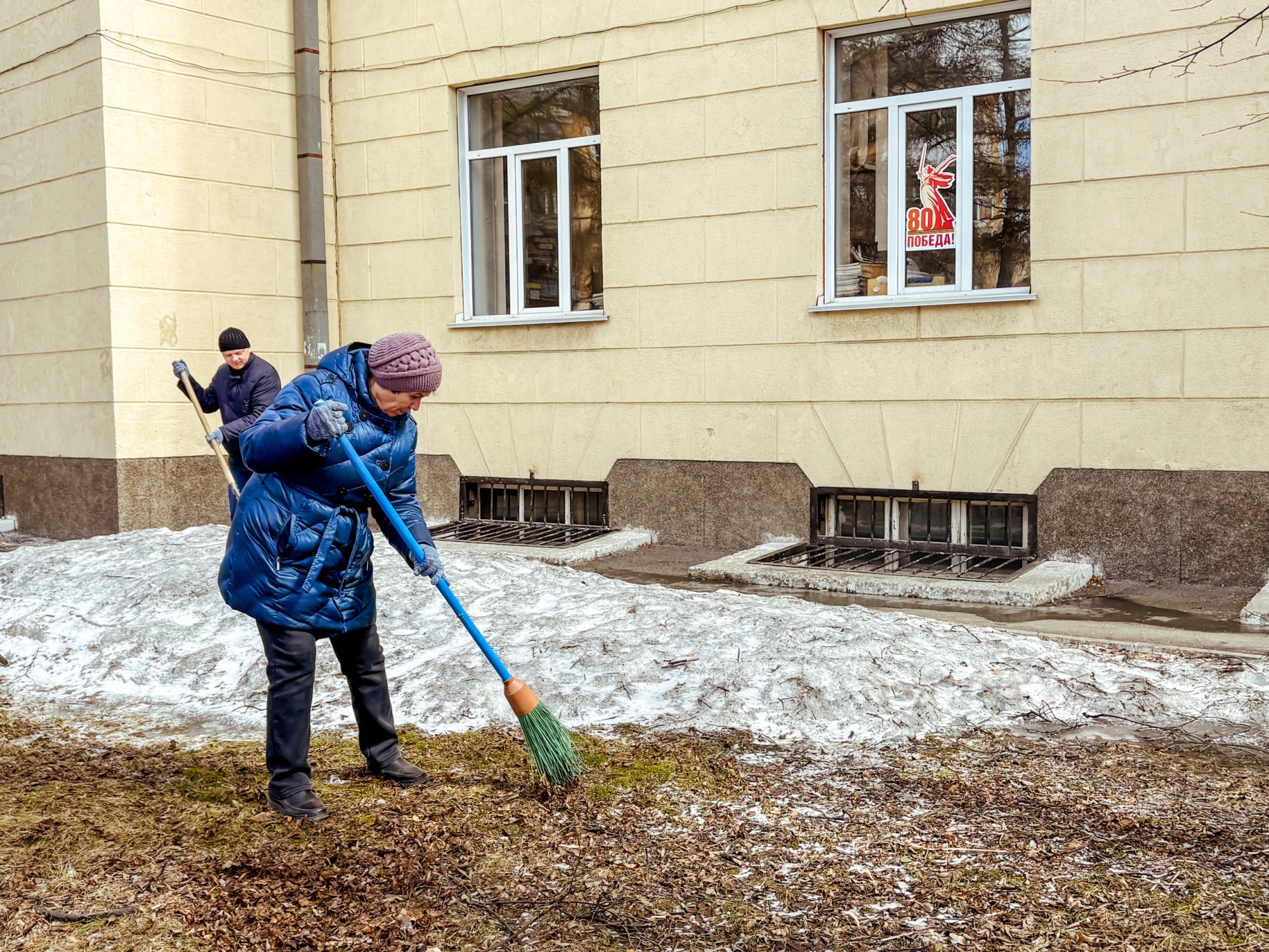 Участники сосредоточились на нескольких важных задачах: ворошили слежавшийся снег, убирали прошлогоднюю листву, очищали землю от накопившегося за зиму мусора. Работа проводилась на территории перед третьим и первым корпусами, а также во внутреннем дворе первого корпуса.