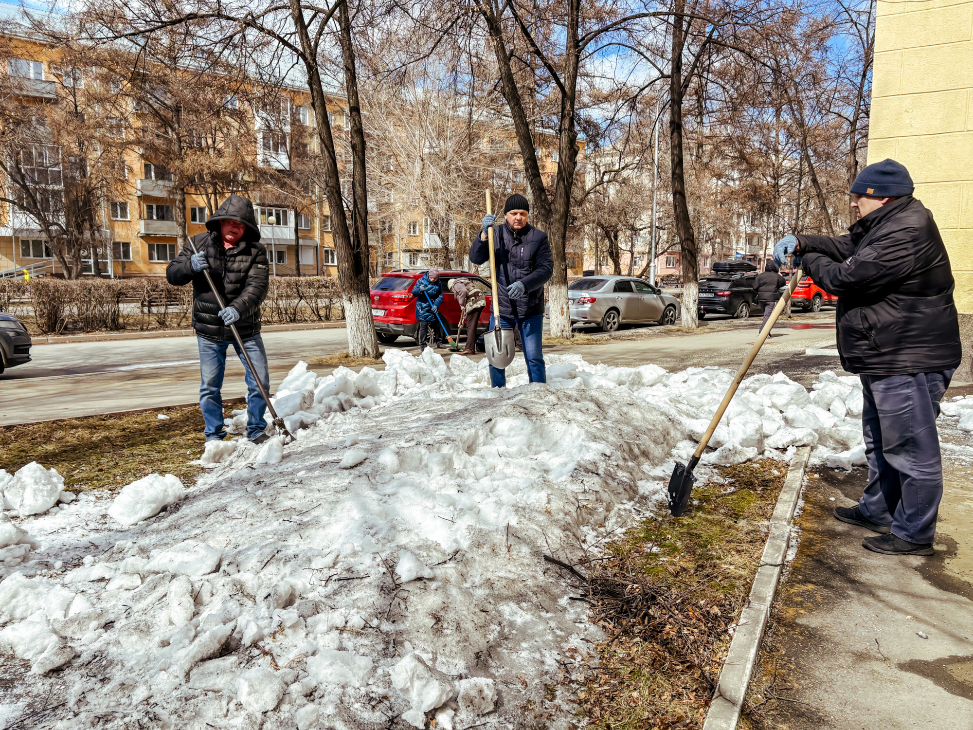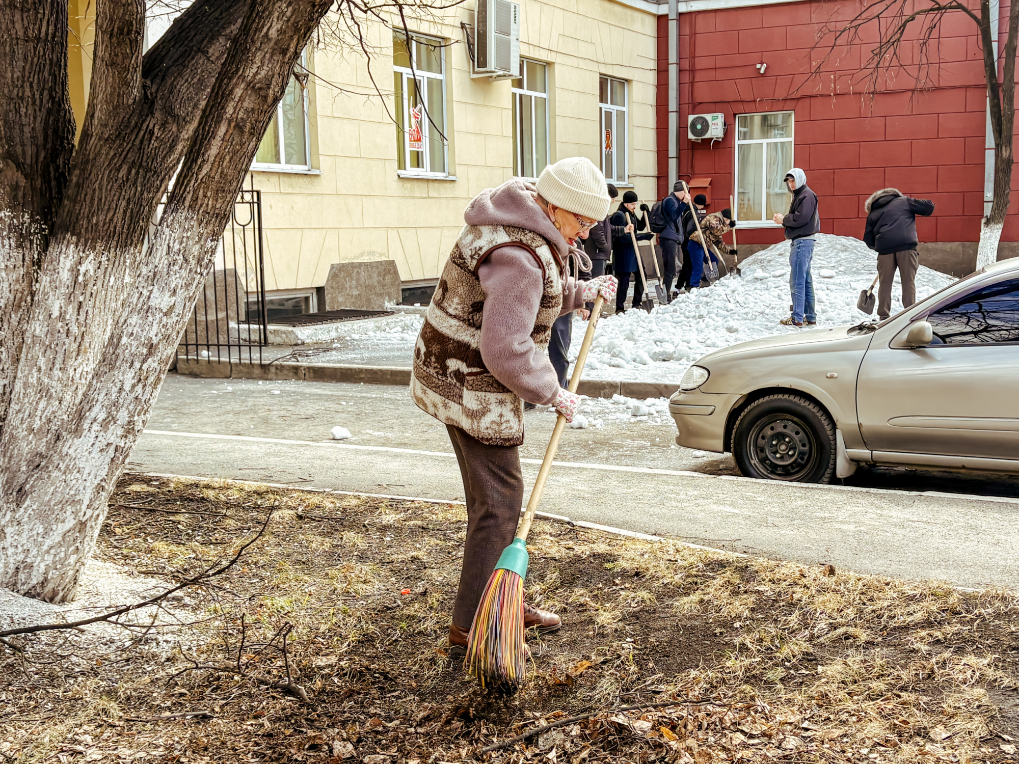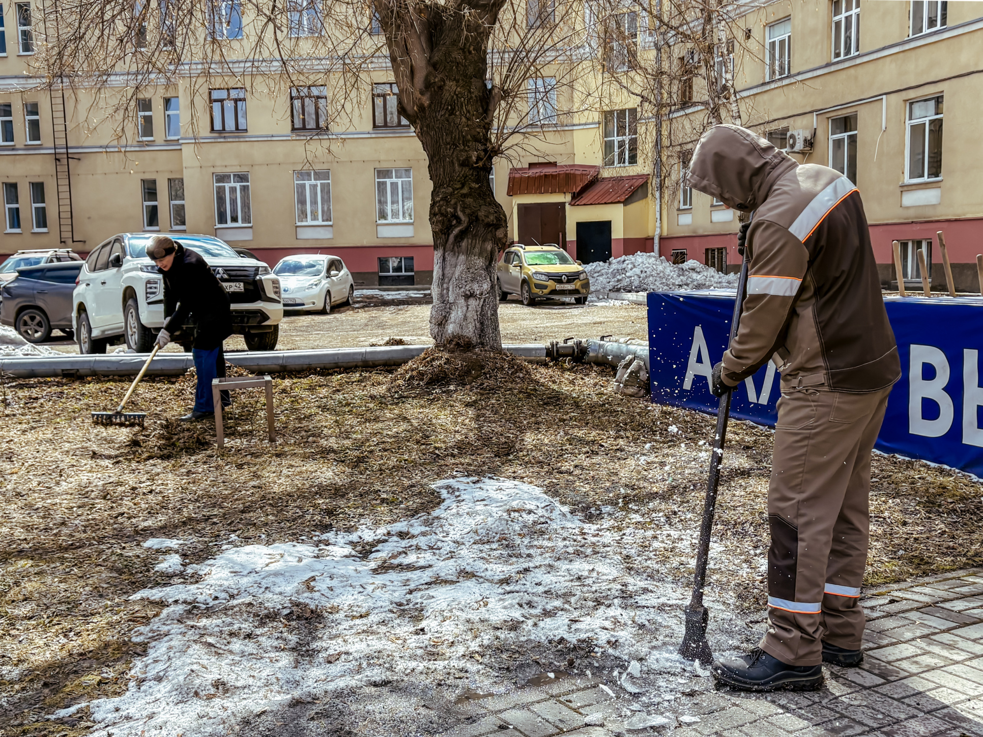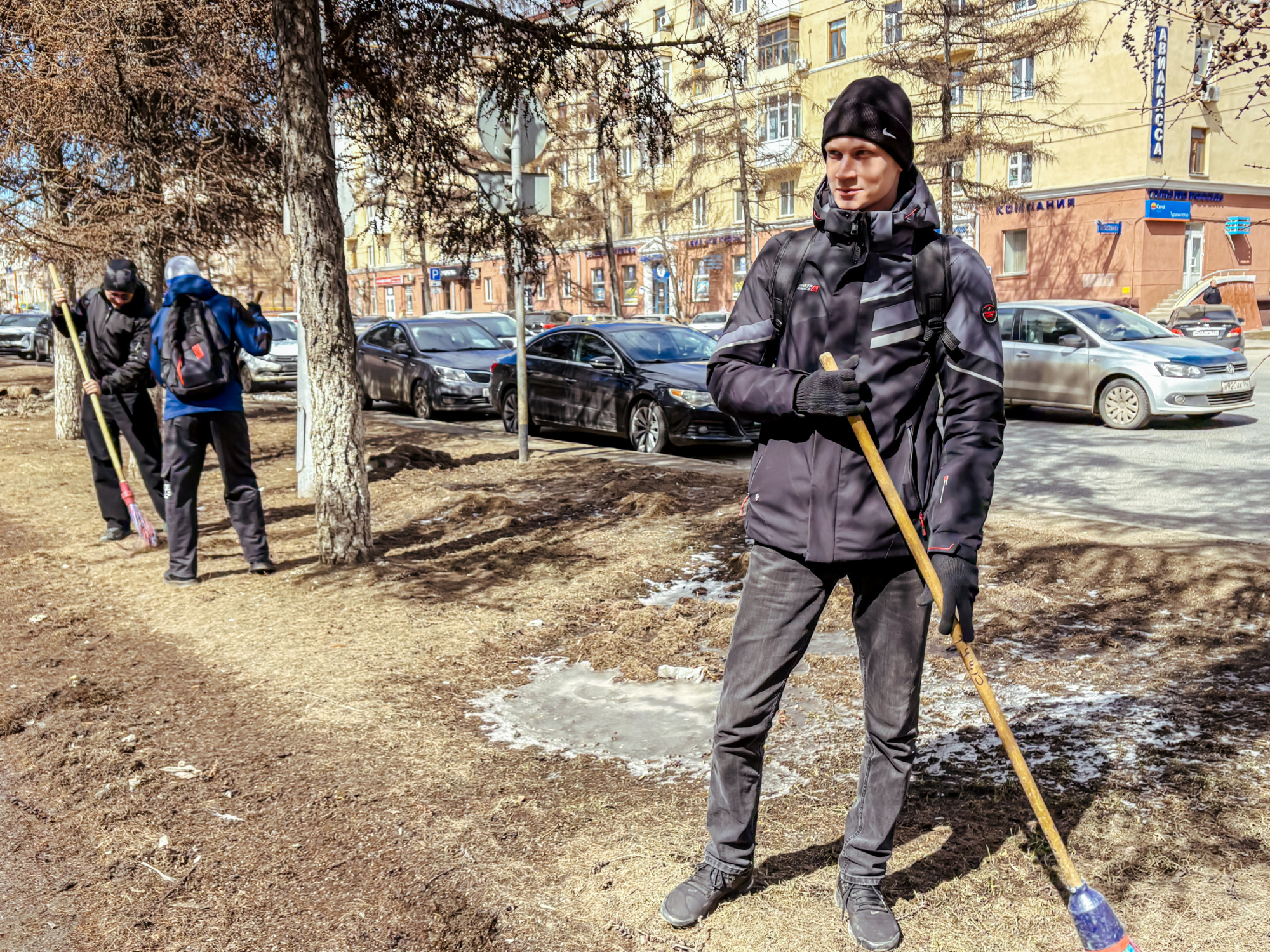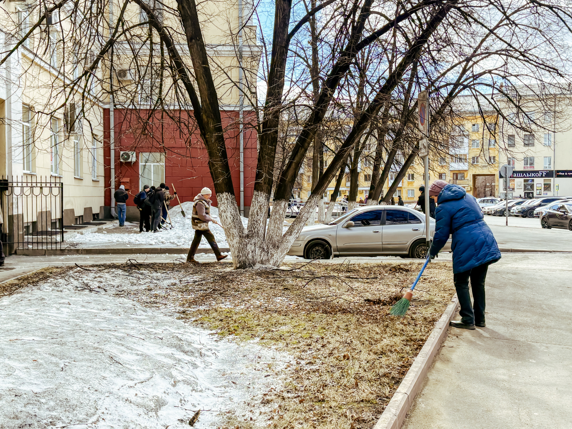Участники сосредоточились на нескольких важных задачах: ворошили слежавшийся снег, убирали прошлогоднюю листву, очищали землю от накопившегося за зиму мусора. Работа проводилась на территории перед третьим и первым корпусами, а также во внутреннем дворе первого корпуса.